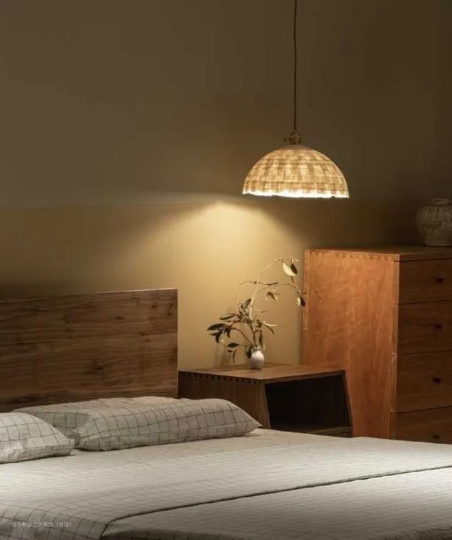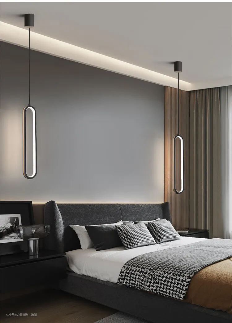 竖线吊灯一直很受年轻人的喜爱,即从床头两侧的顶面安装两只灯线或灯杆的吊灯,这种方式能在视觉上达到拉高层高的效果,降低房间的压抑感;此外,这种吊灯不会占用地面或桌面空间,且一般体积较小,小户型卧室非常适合。