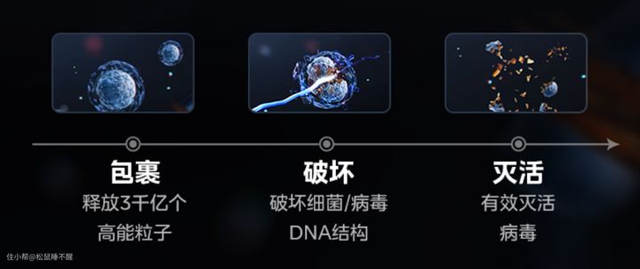 在风机内设有离子云模块,工作时可以释放出每立方厘米数千亿个高能粒子、以及一亿九千万个Be离子,它们会随着气流漂浮到空气中,高能粒子会包裹并破坏掉细菌和病毒的DNA结构,使其失去活性。
