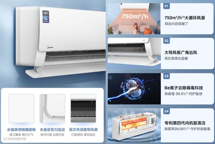 不仅如此,这款空调还搭载了“美的”自研的Be离子云除病毒科技,这是比较独特的地方。