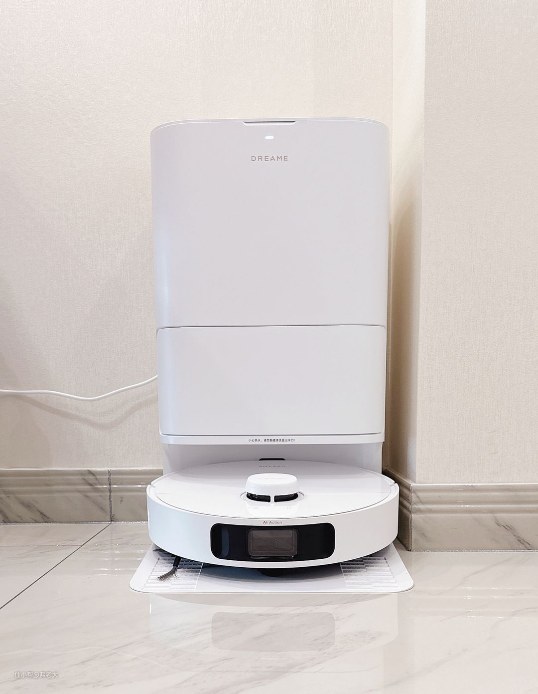 将边刷、拖布模组和电源线组装,很快便完成装配,主机与基站完美合璧,随时准备投入清洁作业。