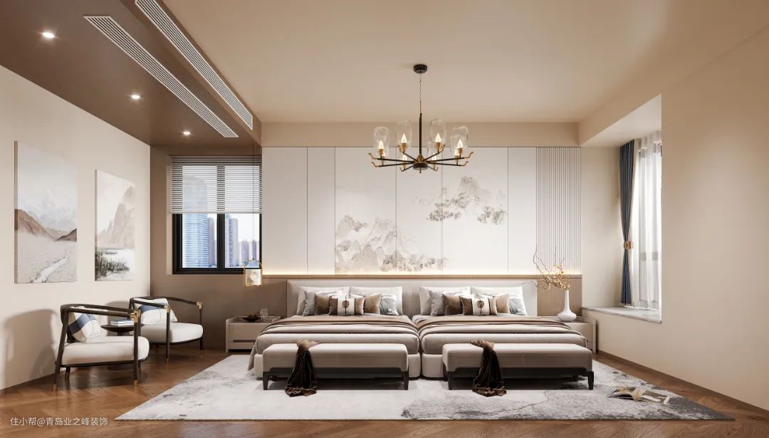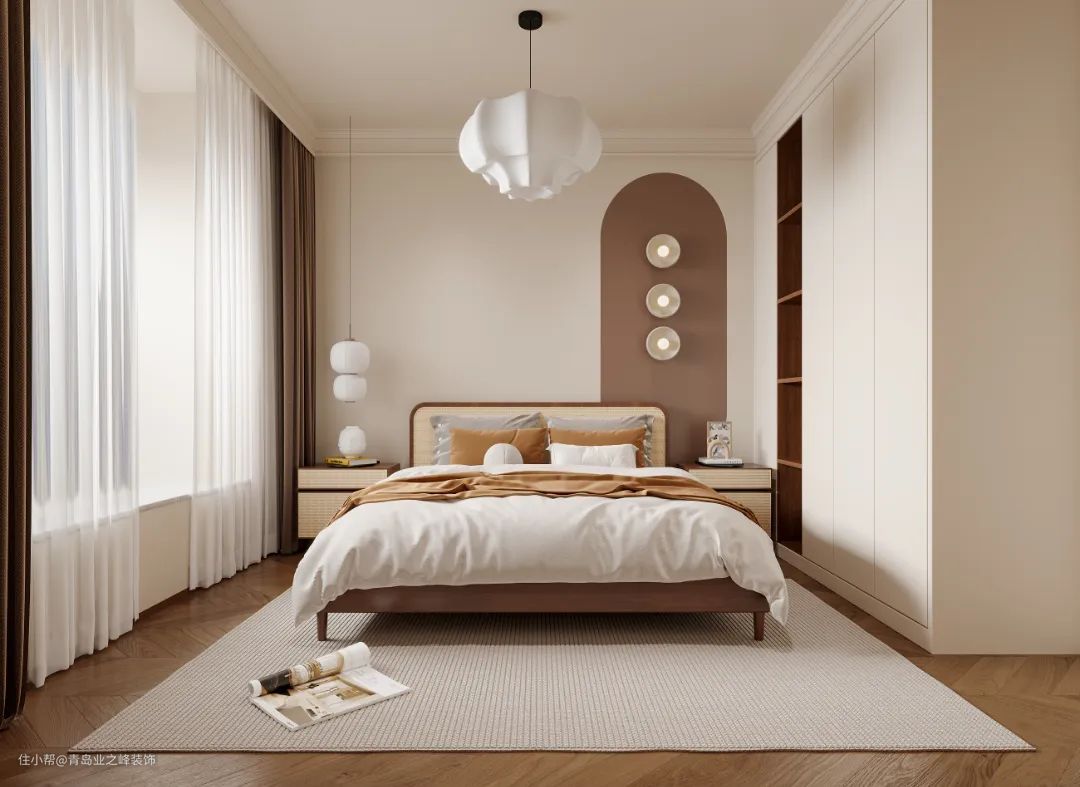 主卧同样以原木色打底,搭配同色系软装,背景墙和挂画不能太复杂,颜色清单简约即可。
