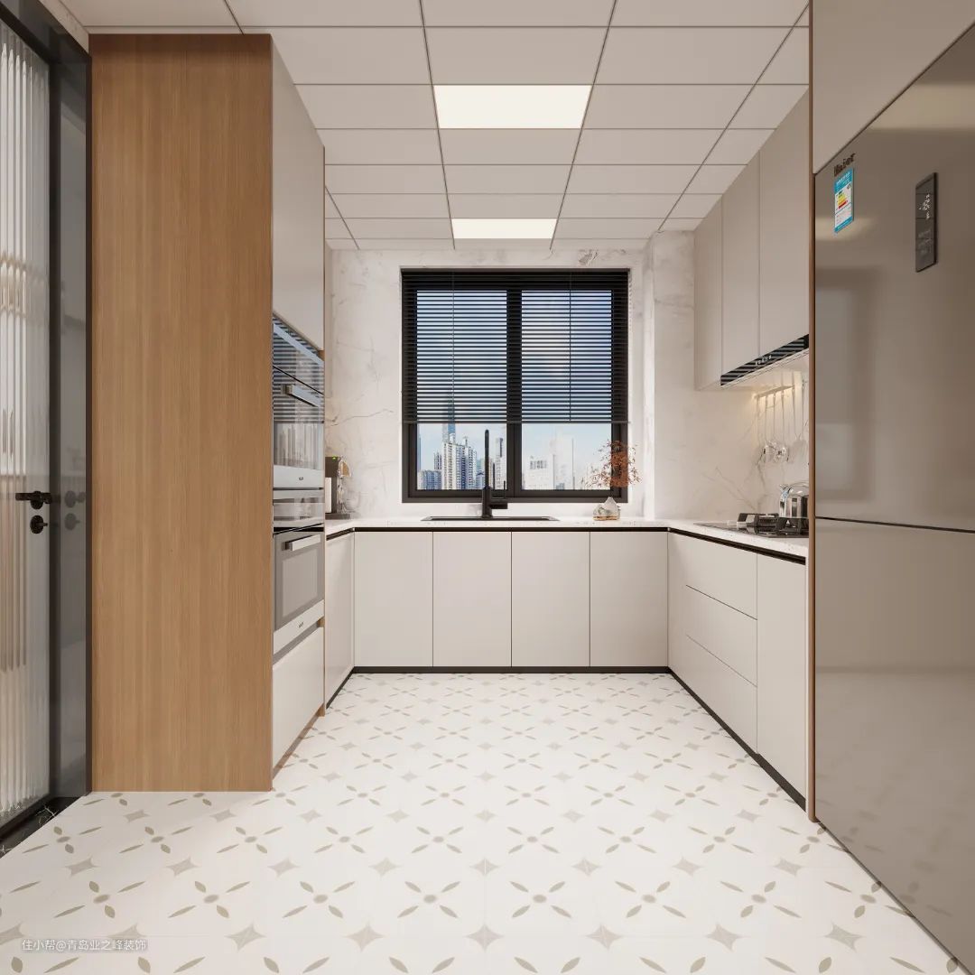 U型橱柜,将厨房空间最大化利用,白色与原木色搭配不会出错,与整体氛围相一致。以业主的身高为参考,规划了操作台面设计,可最大限度减少下厨的疲累感。