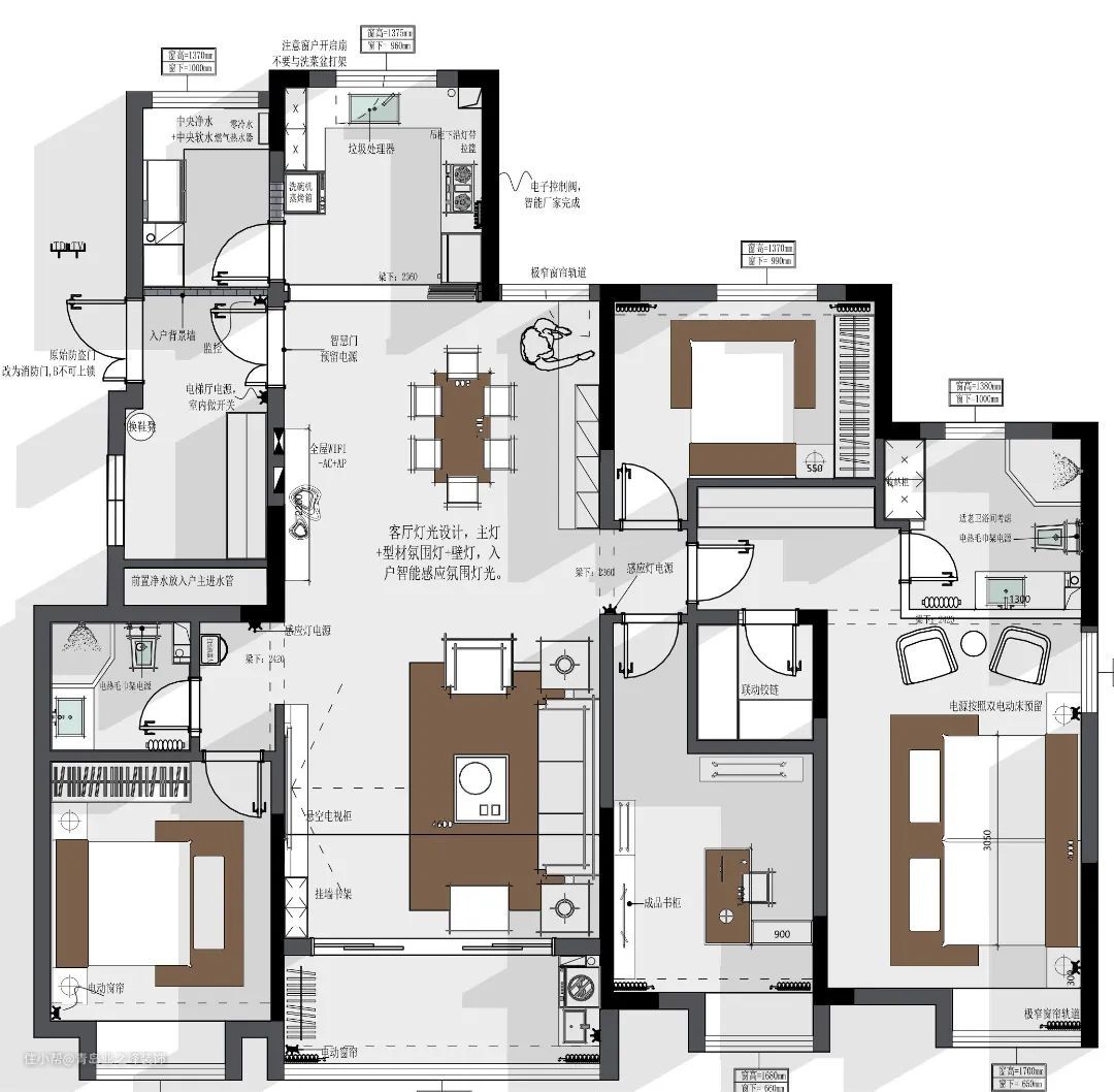 餐桌对面靠墙处做了一组餐边柜,可放置餐具、酒杯、茶壶、纸巾、抽纸、茶叶等物品;台面预留插座,可以满足日常使用小家电,隔断加装感应灯带,增添家居生活的氛围感。