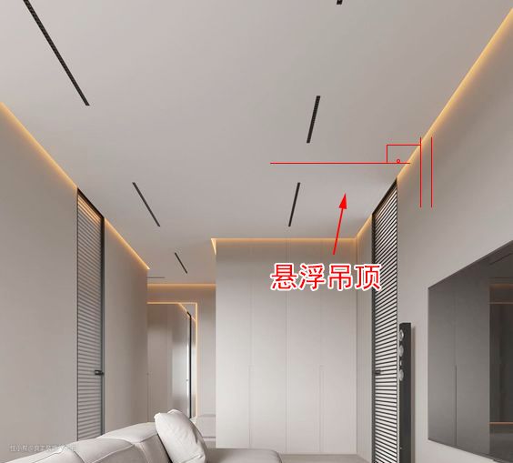 悬浮吊顶的造型形式是:中间平顶,周边采用凹槽组成,通过在凹槽处暗藏线性灯,使视觉上达到提升层高的效果,从而使空间有悬浮的感觉。