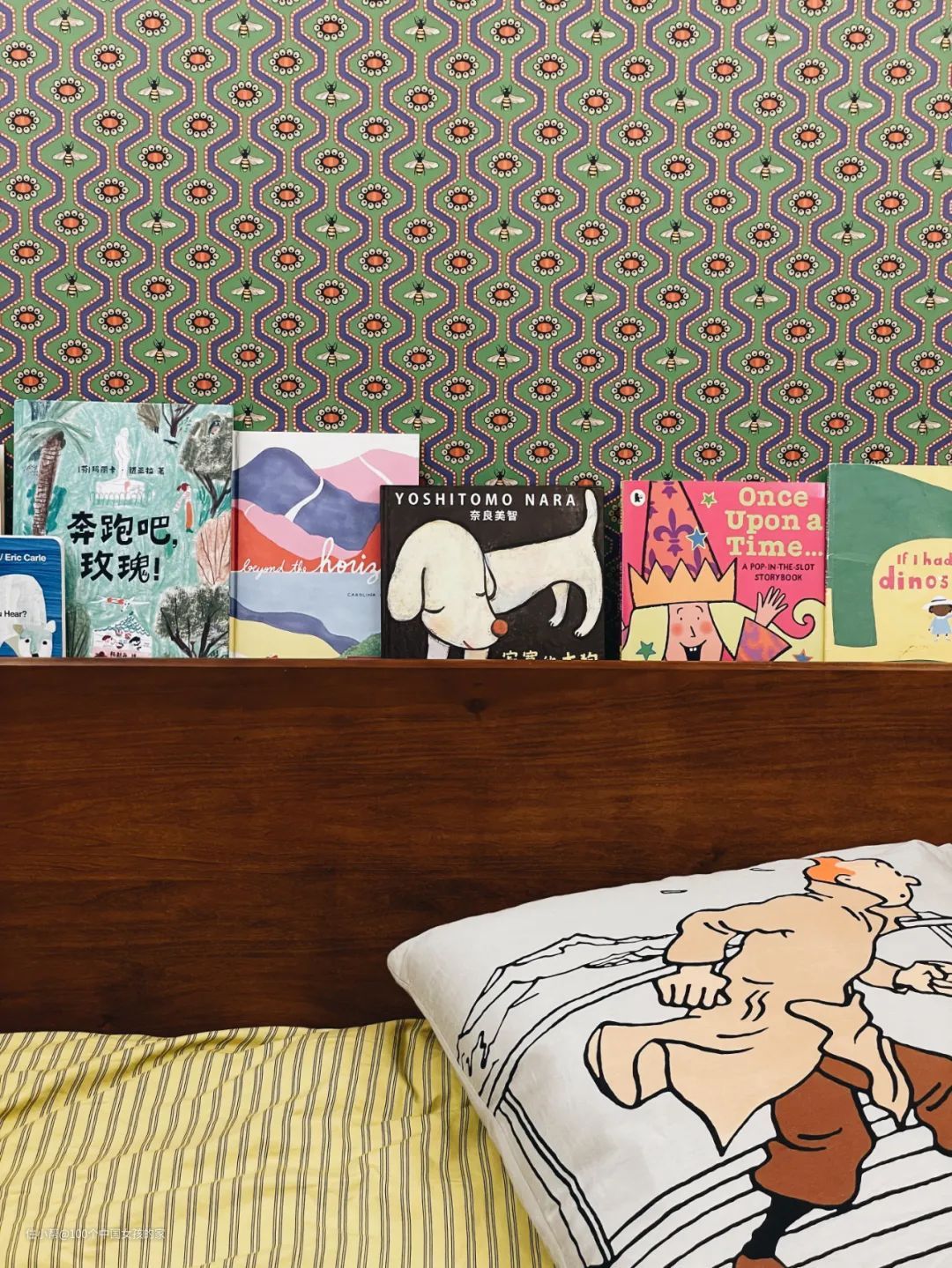 上墙之前自然会担心深色壁纸会不会暗,神奇的是上墙后有一种恰到好处的古典氛围,让卧室的色调沉静,让夜的氛围浸透整个房间,一躺下就很好眠。