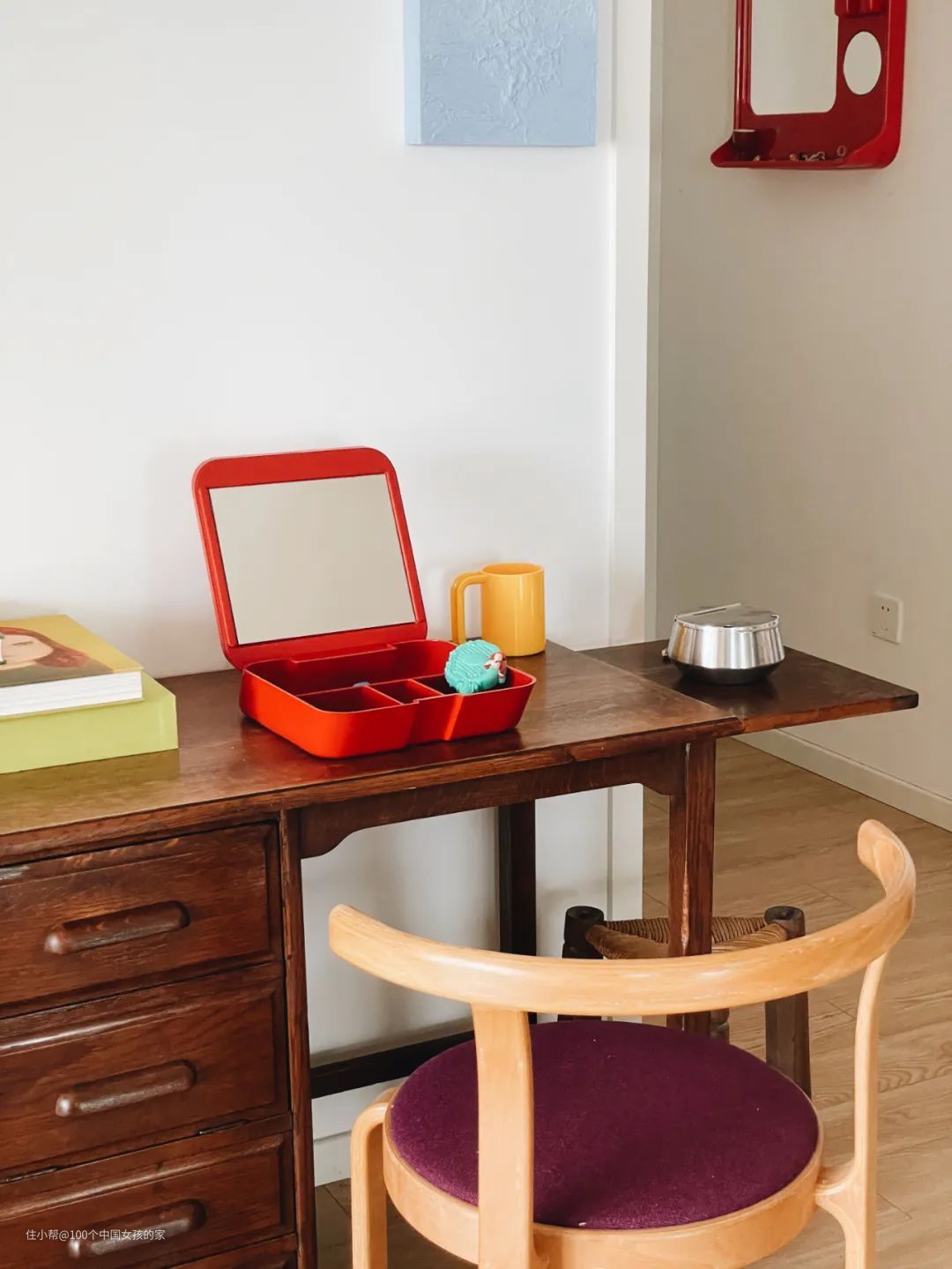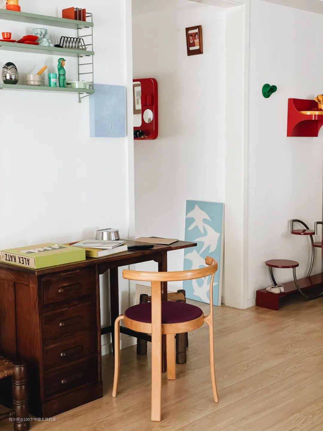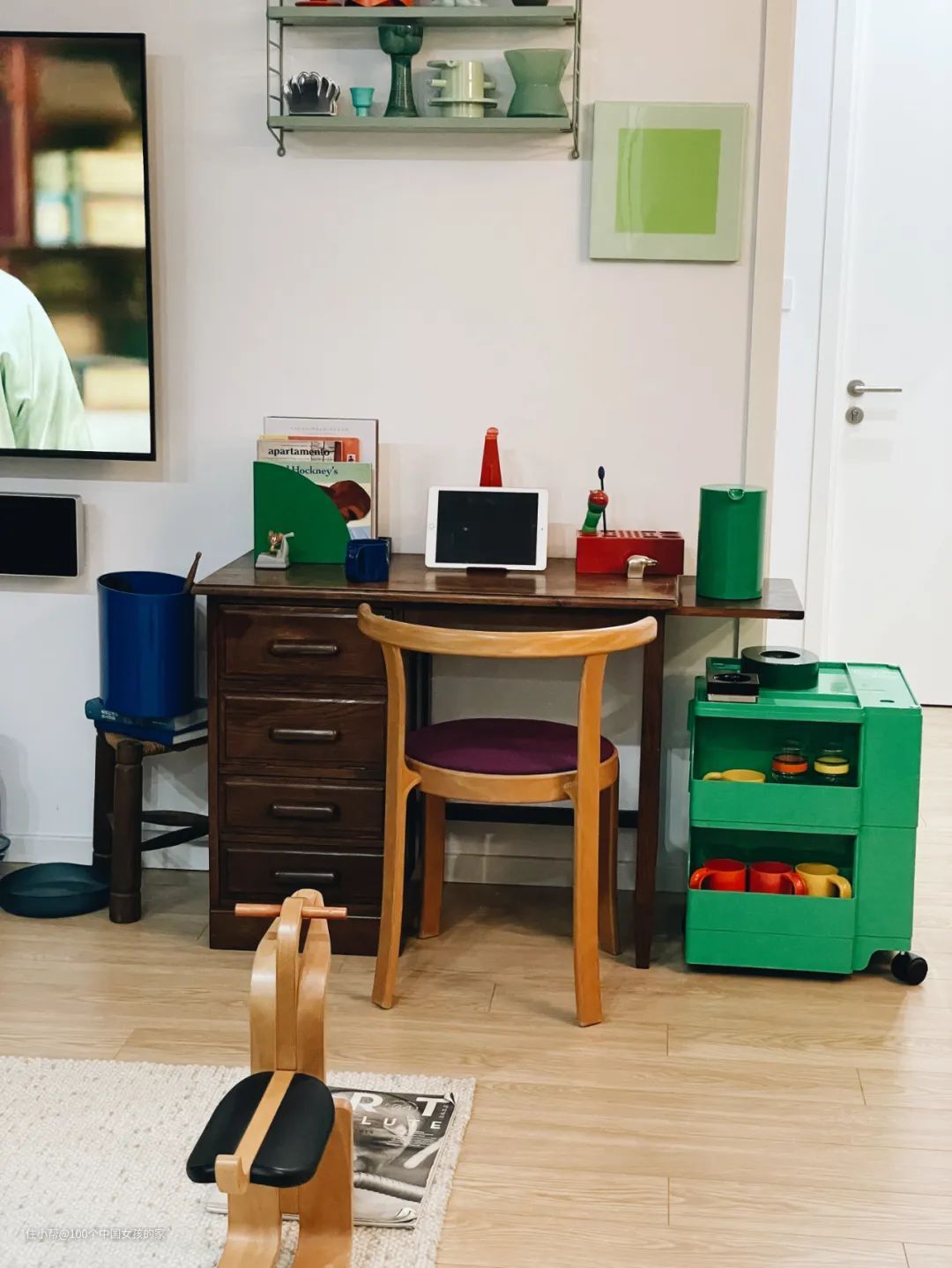 我尤其喜欢小书桌,旧旧的复古感,配了一把Magnus Olesen的堆叠椅。书桌是50年代的物品,抽屉拉出来是弧形的杂志架,右边能拉出一个加长的小桌板,充满了小惊喜。