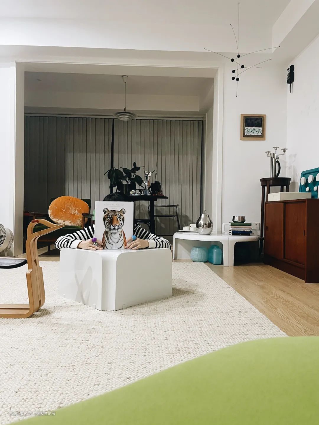 有时靠在墙面上,有时叠放在墙角,小朋友坐在地毯上看书时,它的高度也刚刚好,莫名萌趣可爱,她会试着去拼凑这个茶几,像摆弄一个大玩具。