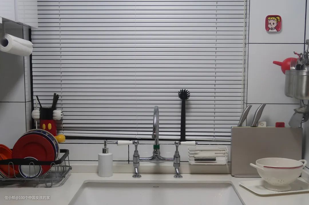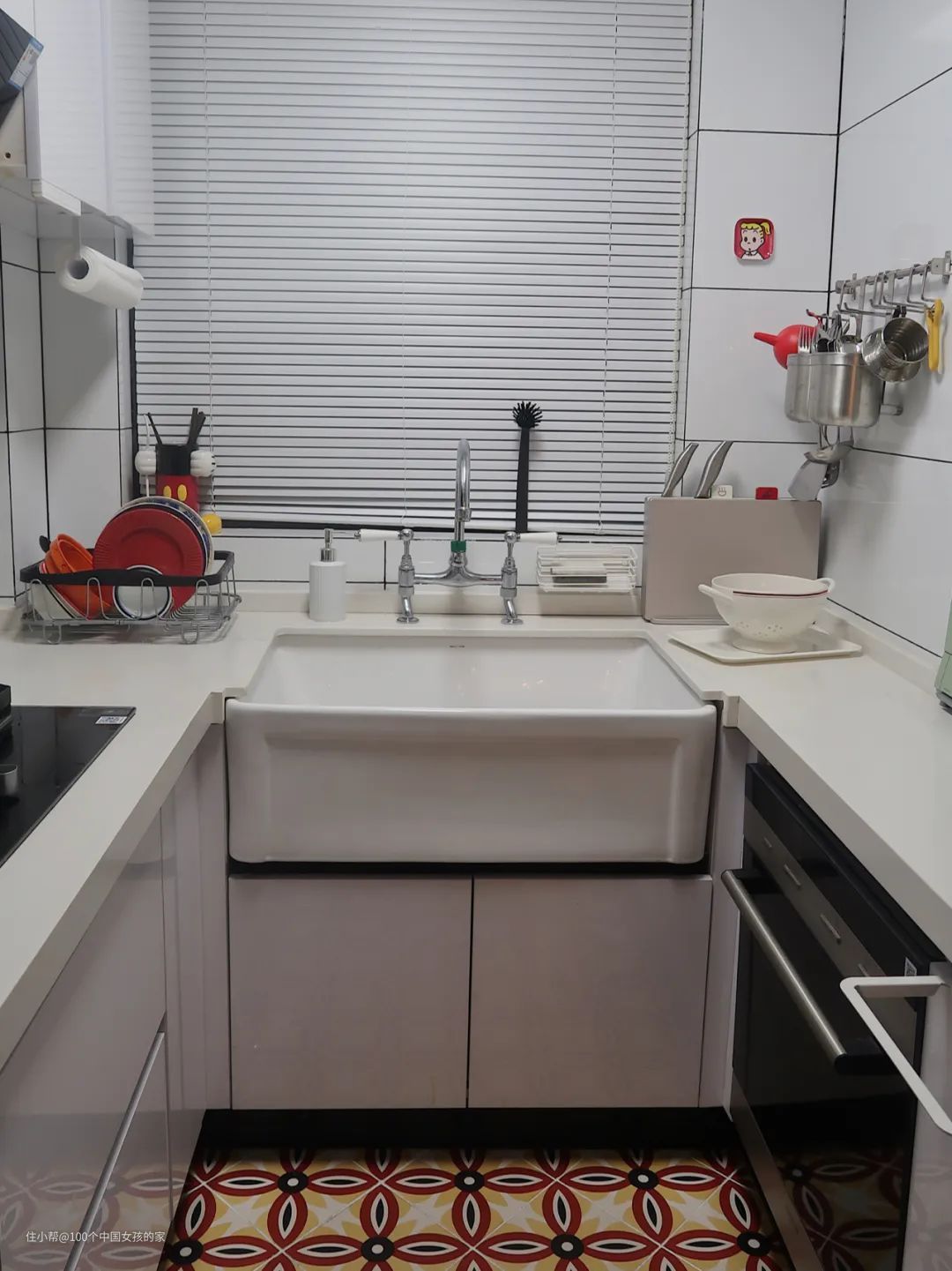 餐桌后面有一个小厨房,在奶白色的基础上,加入了一点跳跃的细节:花砖。