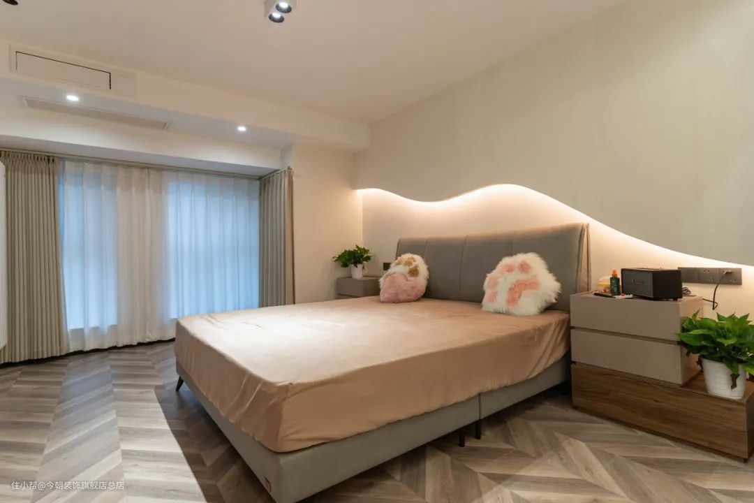 主卧中「水平方向」的弧形元素起到圆滑过渡的效果,给人一种向两边无限延伸的视觉感,「放大」居室空间,消除压抑感。
