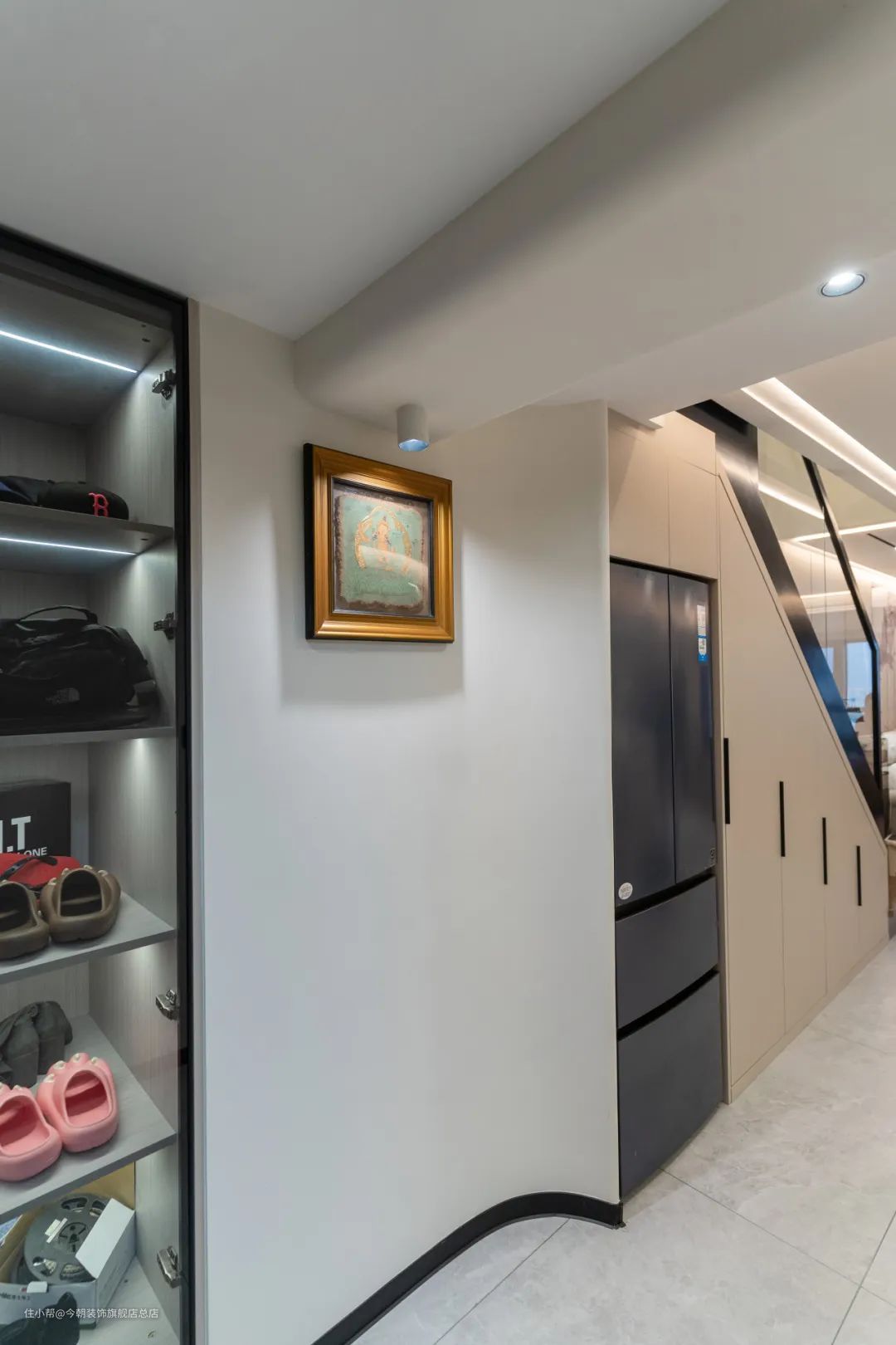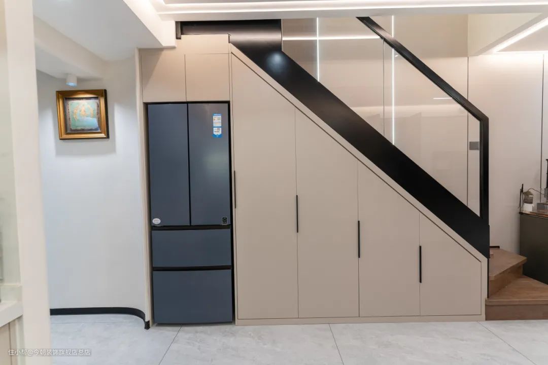 由于空间有限,且考虑到动线,冰箱并没有安置在开放式厨房中,而是嵌入到楼梯下方的空间,起到节省空间的作用,也让整个空间看上去「整体性更强」,更加清爽整洁美观,极大程度的提升空间的可利用率,减少空间的浪费。