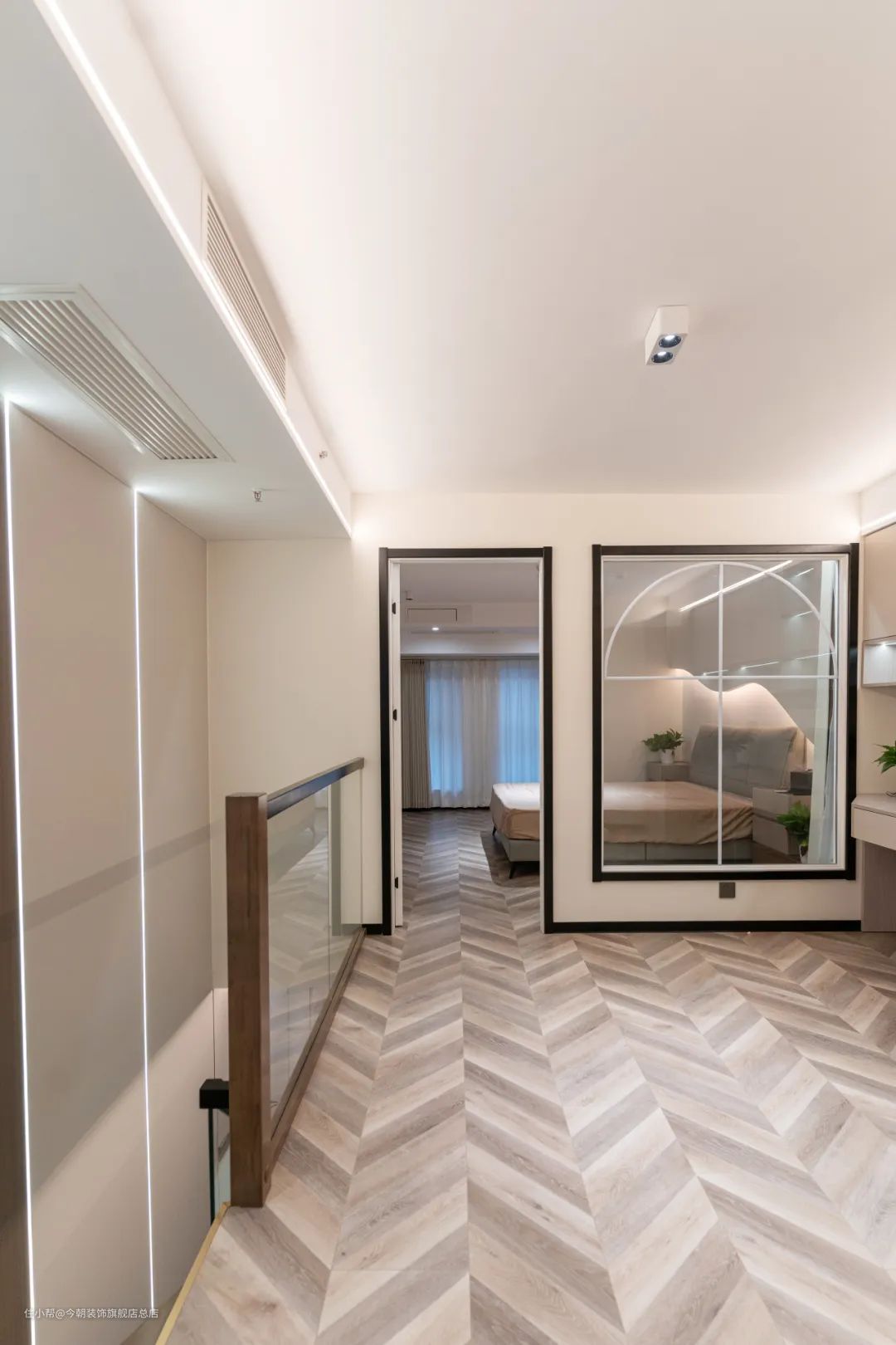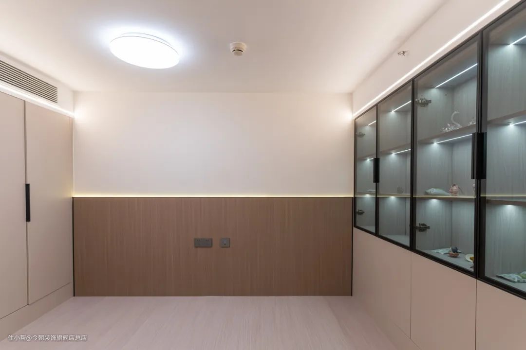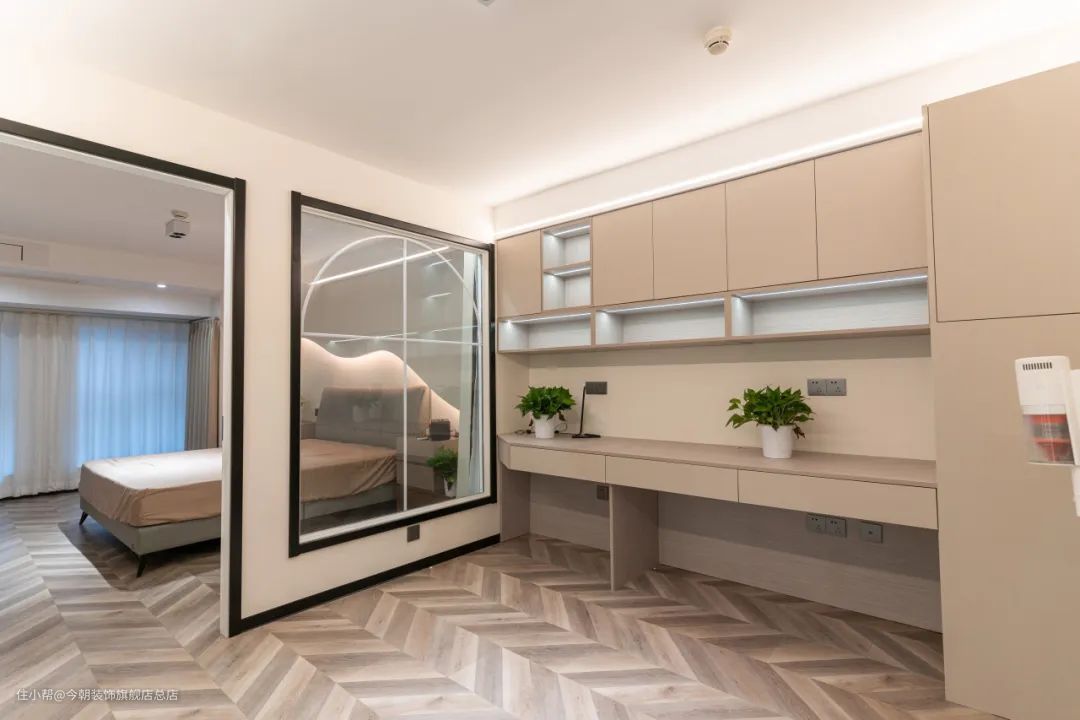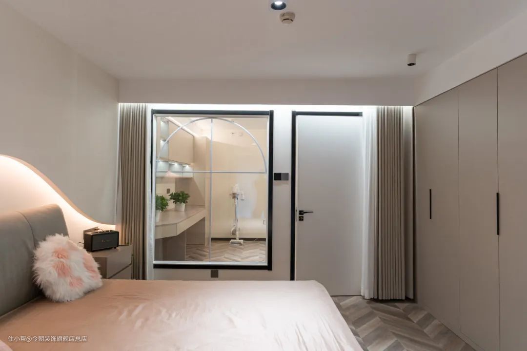 主卧一侧设计了室内玻璃窗。解决了采光问题,增强了互动性。
