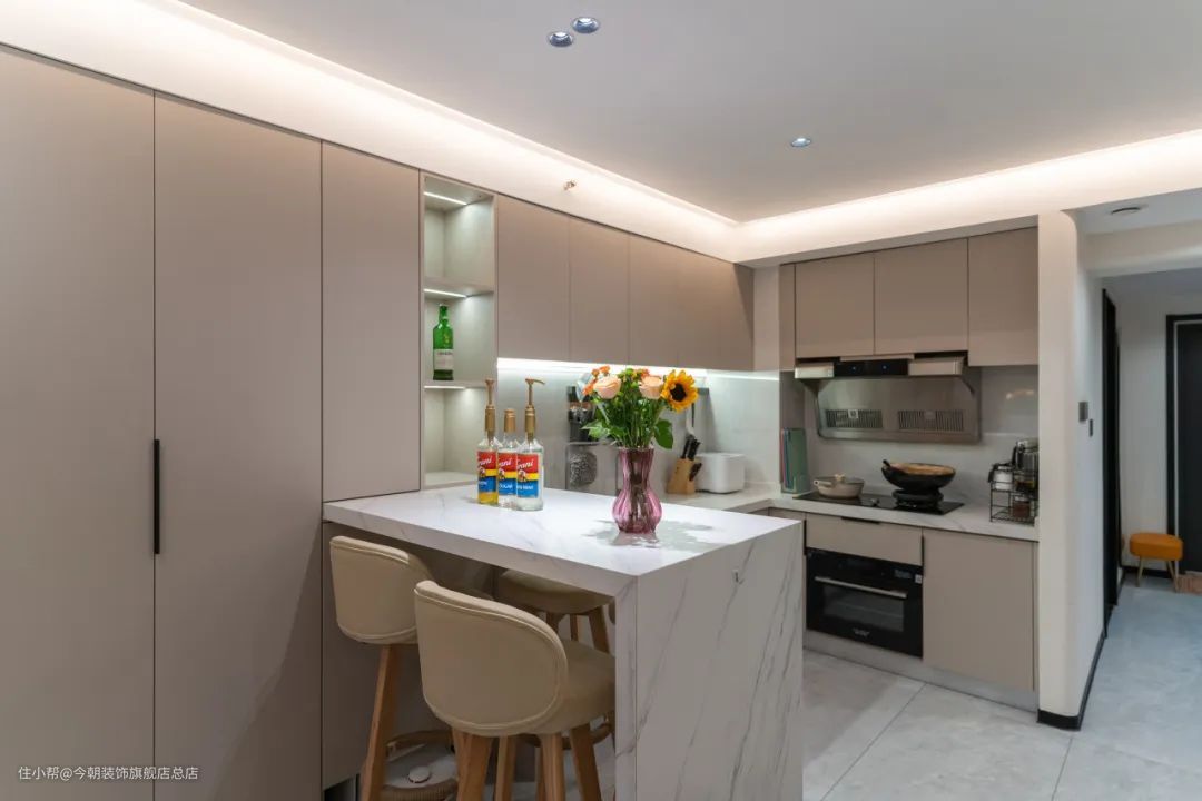 筒灯、射灯、吊顶的灯带、背景墙的装饰灯、吊柜的层板灯,穿插结合,以满足不同场景的需求。