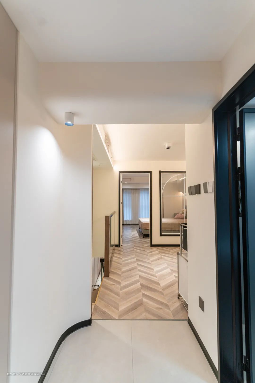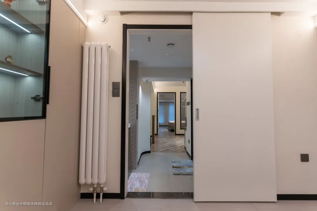 次卧选用隐形式室内门,遮挡住谷仓门的轨道,一体化,更美观。