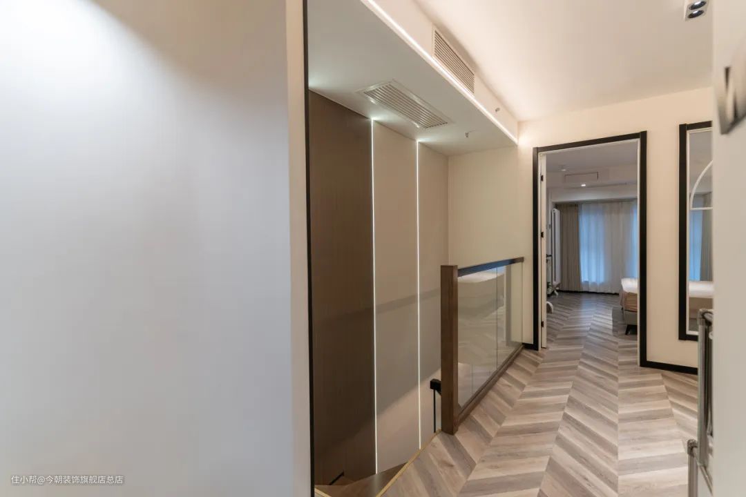 二层地面的地板选择的是鱼骨拼。鱼骨拼接的木地板整齐有序、扩大视觉效果。装饰效果更具有冲击性,在视觉上层次感更丰富。