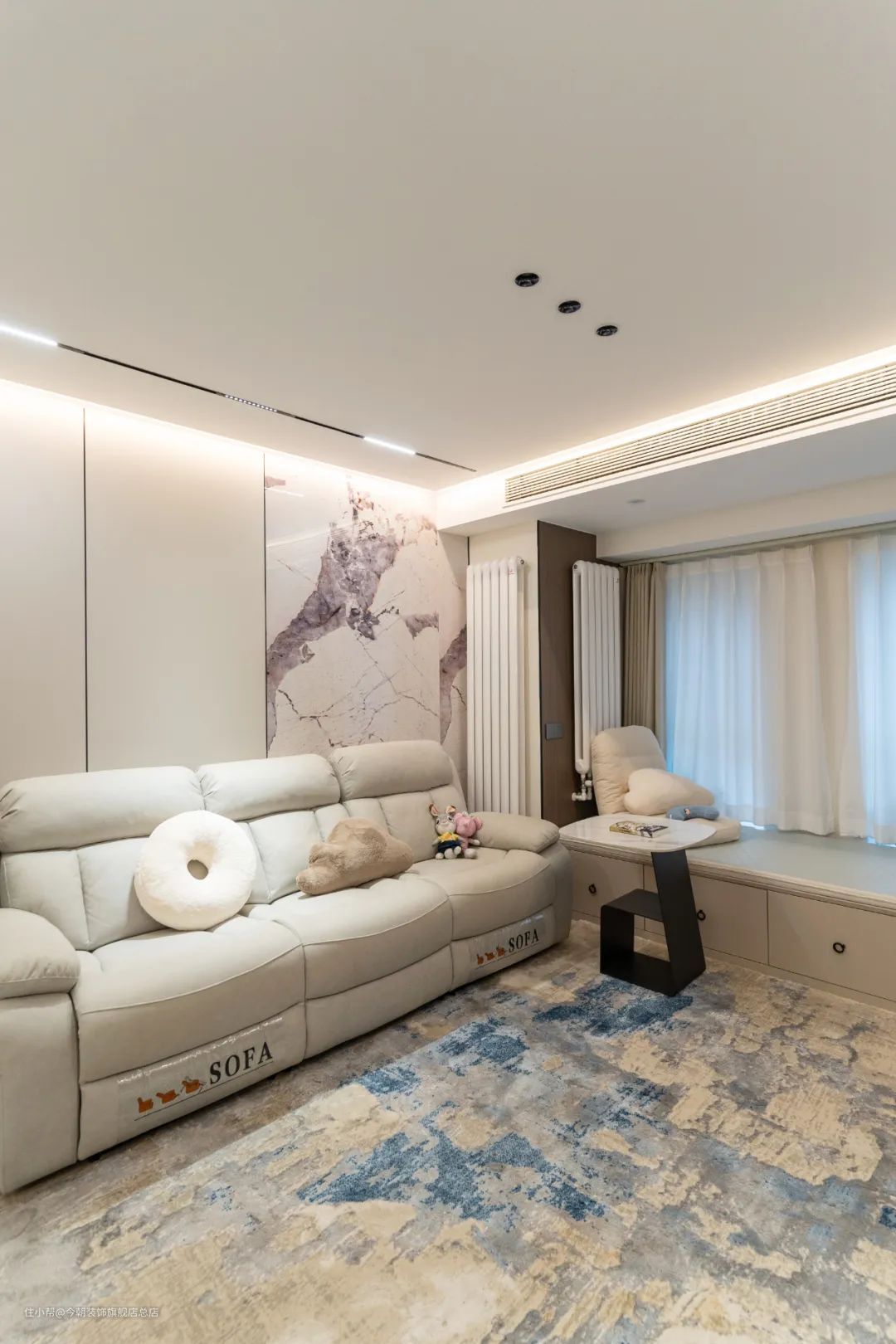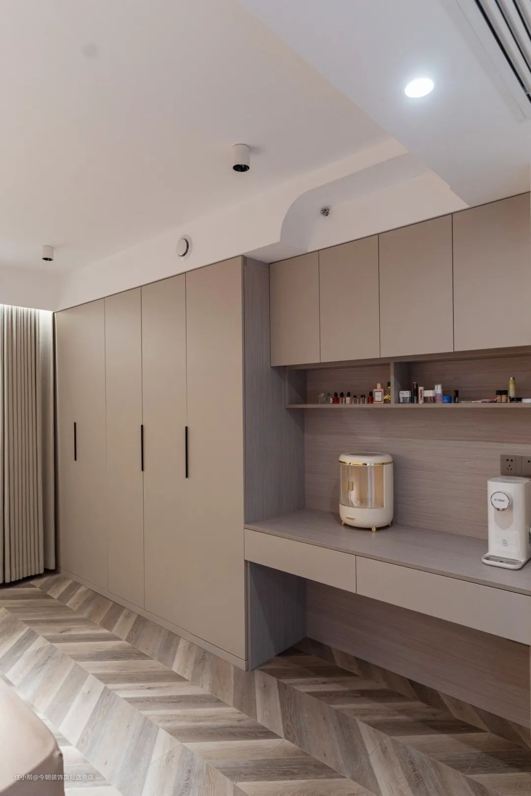 卧室内部有窗帘盒灯带,设计为向上打光,只有窗帘顶部被照亮,营造氛围却不会影响休息。