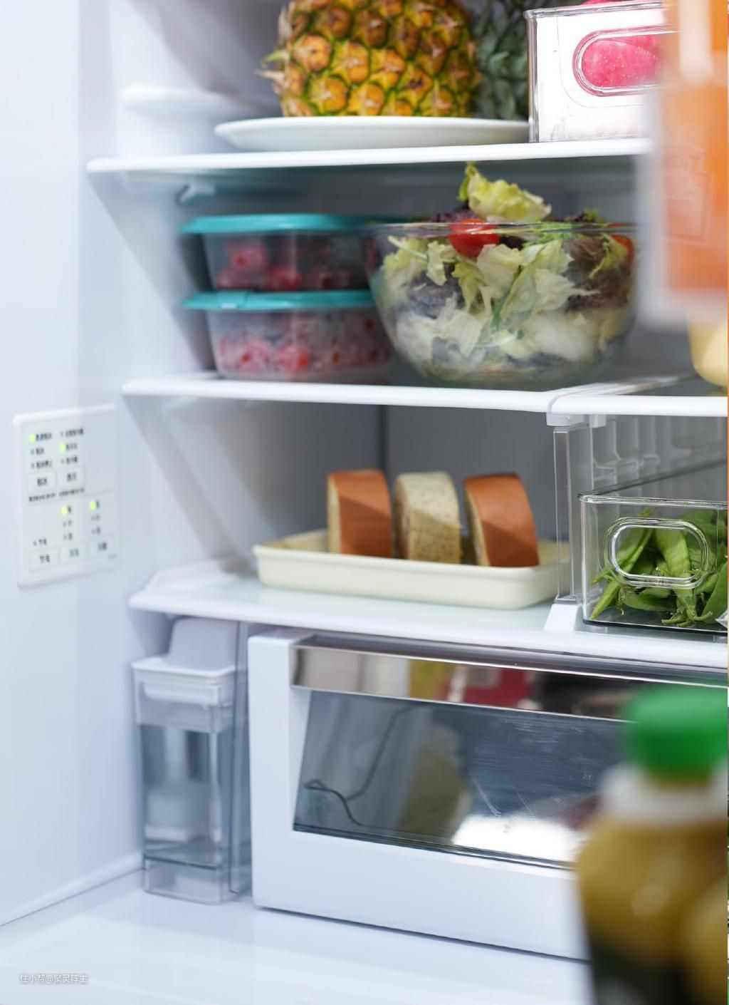 接下来再看看冰箱内部的保鲜效果如何吧!首先是上层冷藏室的润泽低温区域,提供了温度在2℃左右和湿度在80%左右的双重环境,使食物表面保持水润,这种方式下保存的食材,即便是没有使用保鲜膜,也能抑制食材表面干燥及变色,留下更好的新鲜度和口感,对于叶类蔬菜的保存格外友好哦。 下层冷冻室设计的美味速冻区域,使用大型铝盘来加快吸热速度,配合传感器,当放入温热食材时,传感器感应到食材温度,自动切换运转,让食物的温度更快降低,以此避免内部大冰晶颗粒的形成,更好的保留食材本身的水分和营养,这样后续吃起来也不易导致口感变差,在这里存放肉类、婴幼儿辅食和温热食物都很合适。