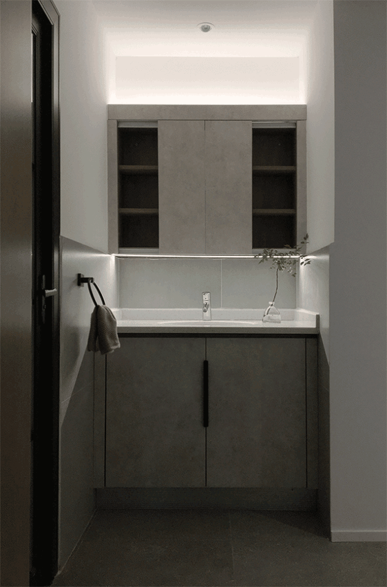 因为布局原因,外移的盥洗区镜面正对卧室门,设计师通过一组定制柜将镜面巧妙的藏了起来,平时用不到时,柜门闭合,镜面就能藏进柜内。