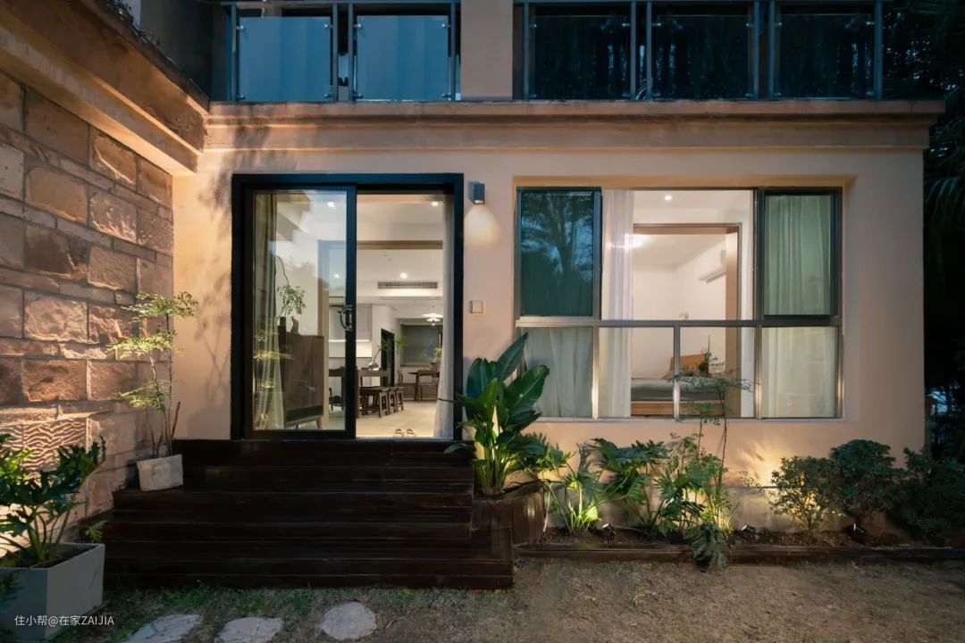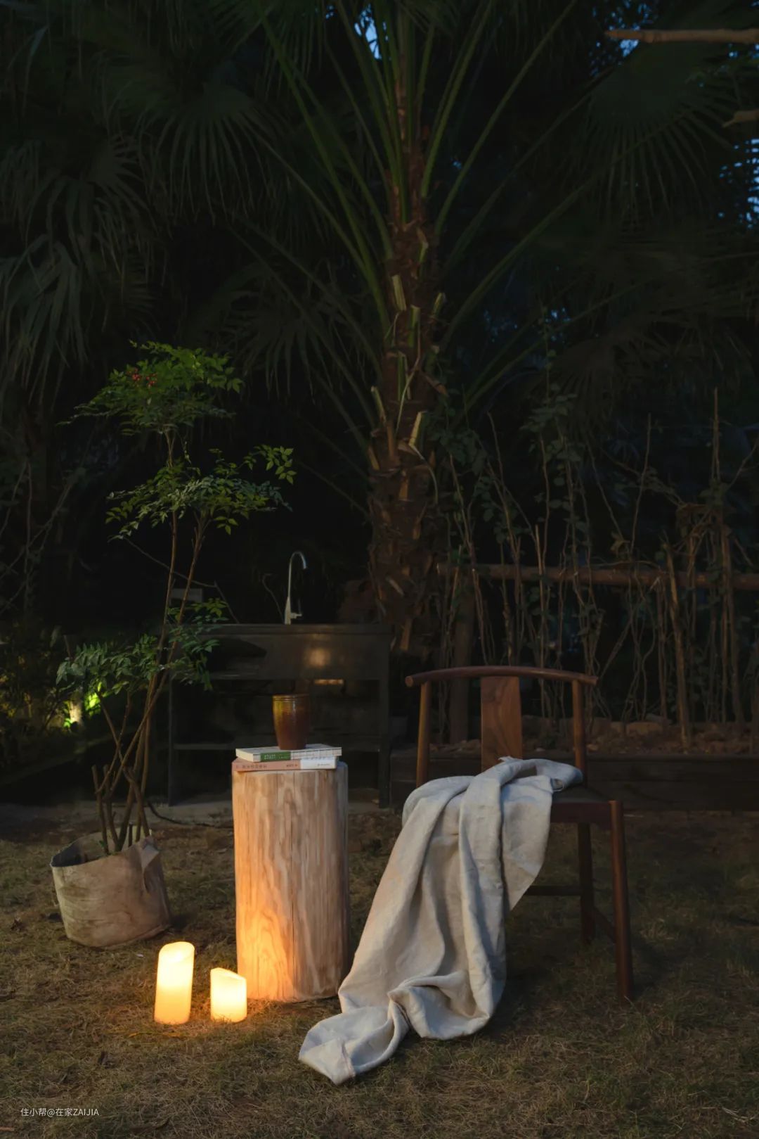 小院子面积约30㎡,改造时设计师在院子里铺了青石板,绿植间点缀着点点灯光,男孩们下晚自习后,总能迎着院子里的灯回家。