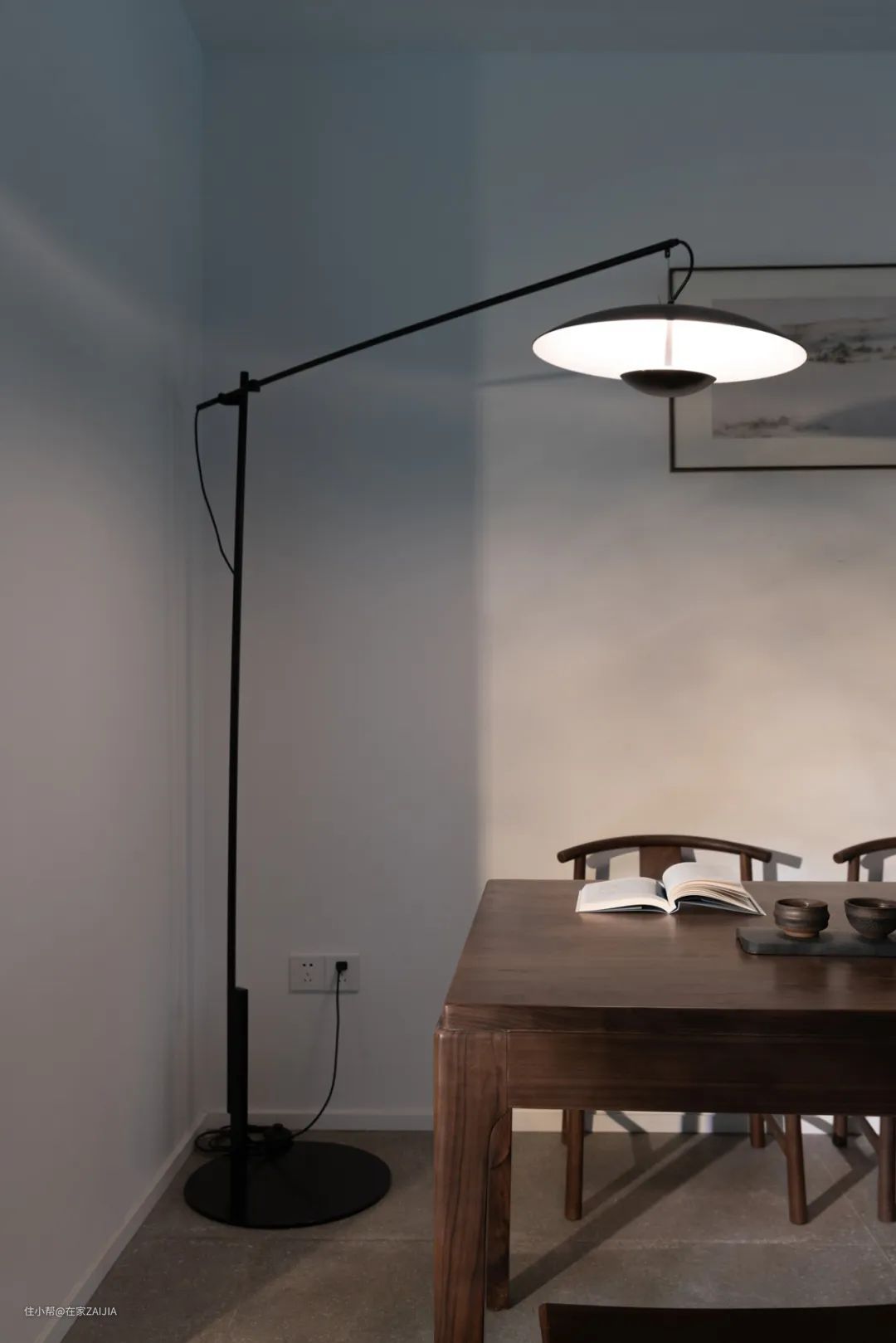 整个客厅空间都采用了无主灯的设计,顶面有三排筒灯作为日常照明,桌边的落地灯则便于阅读时使用。