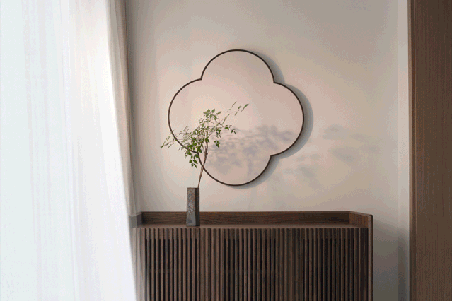 另一处玄关设置在花园与客厅的连接处,梅花框搭配黑胡桃格栅斗柜,轻描淡写的体现出中式风格的素雅之美,不会给人用力过猛的感觉。
