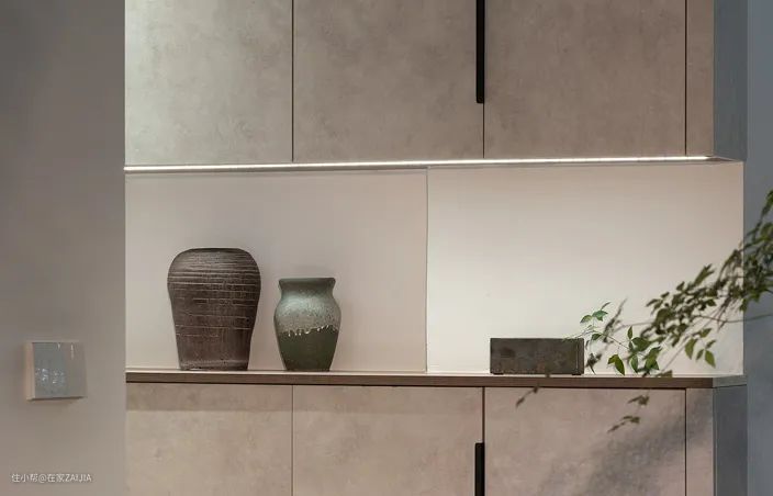 玄关柜嵌入氛围灯带(需要提前在柜体上开槽嵌入),灯带勾勒出柜体边框,让空间显得更精致,点点微光也能丰富空间层次。