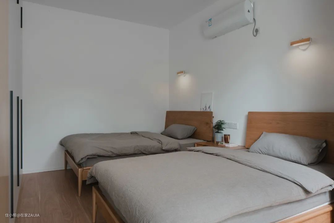 次卧为儿童房,不同于我们常规印象中的儿童房,两个男孩的房间延续了整屋的原木色调,简单的装饰营造出质朴氛围感。