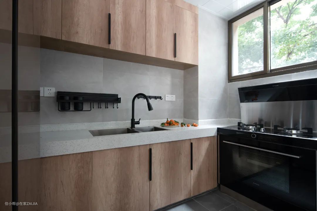 厨房水泥瓷砖与木质柜体的搭配,延续了整屋风格。橱柜内部是原本泥工砌筑的,台面为白色石英石,木质柜门是颗粒板压膜的,防潮耐擦。
