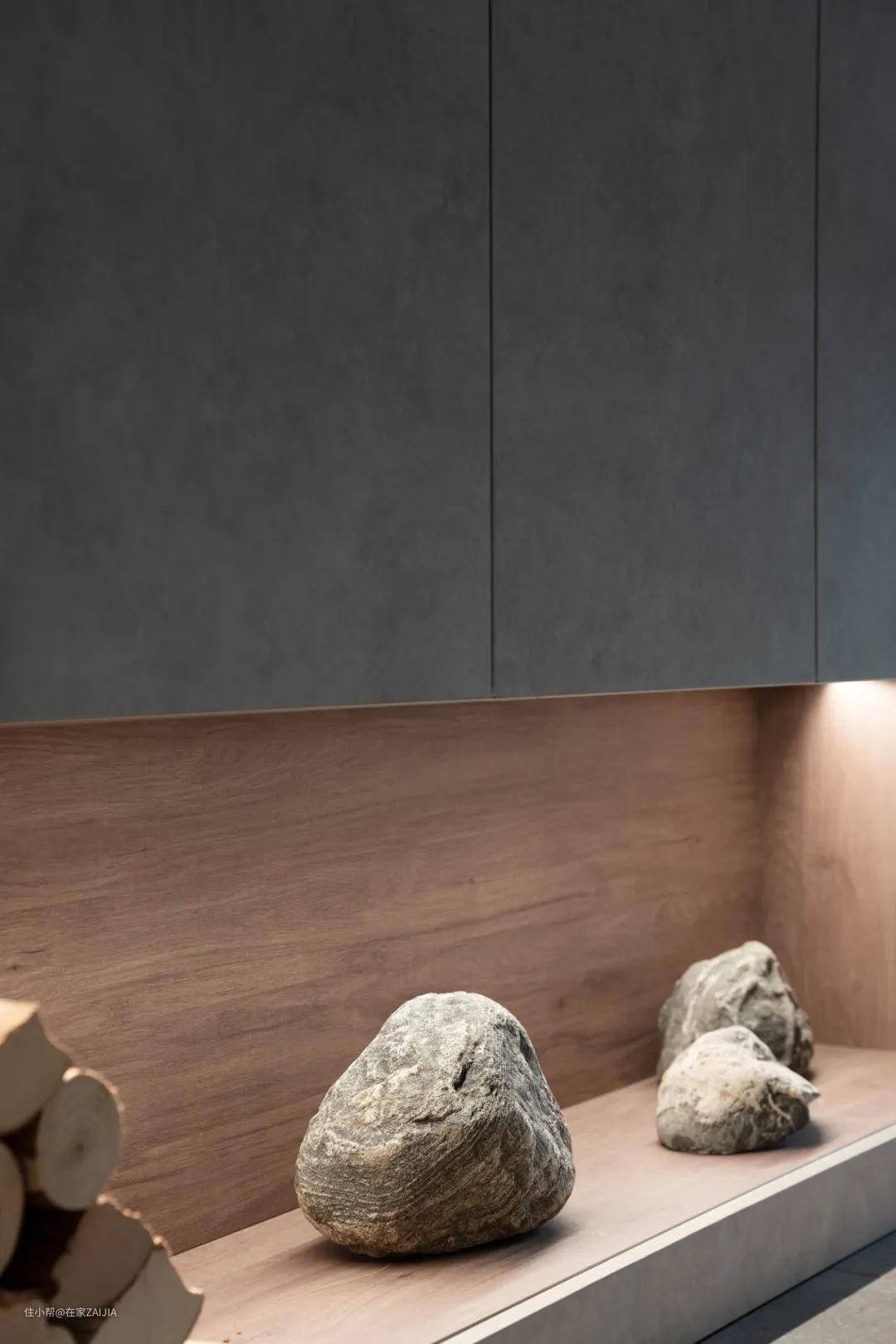 柜体下层的木柴与山石用作装饰,贴合空间最初设定的质朴特性。