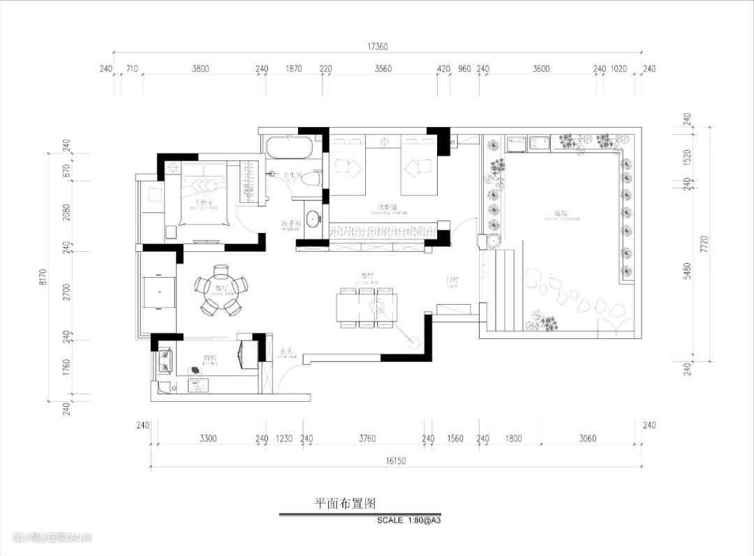 为呼应主题,整屋地面以水磨石瓷砖来表现,搭配黑胡桃明式家具营造中式氛围感,同时借鉴了江南园林的借景方式,增强室内外连接。
