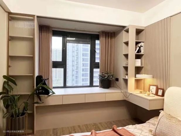 把飘窗与书桌融为一体来设计,不仅能满足房间的书桌功能,也让飘窗空间不被浪费。同样也是以飘窗台为基面,定制一张书桌固定在上方,桌台面一般为70~80CM,可以利用这个高度差做一个抽屉来收纳物品。书桌一定要比飘窗至少飘出来30CM左右,避免坐下来后,下方的墙会顶脚,这样会很不舒适。