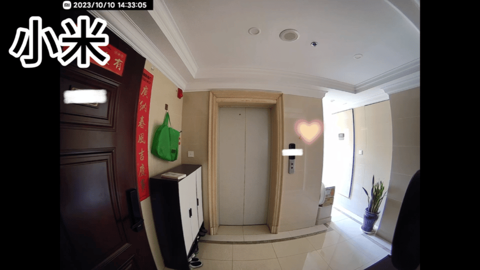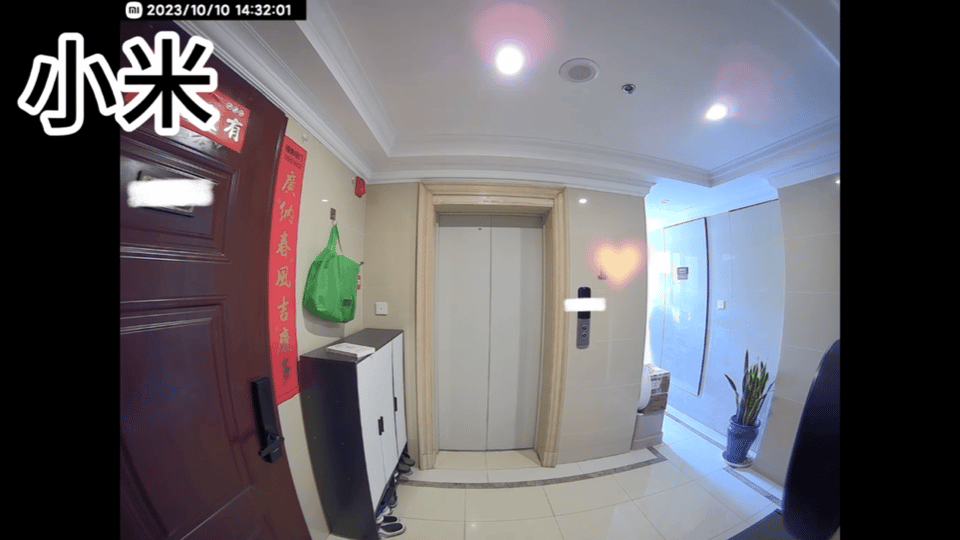 小米 门铃3, 摄像头是180°的视野,但是底部位置基本拍不到, 从前面位置排列来说, 小米的位置应该是属于比较好的位置了, 靠外, 同时我并没有把他放到最高的位置。
