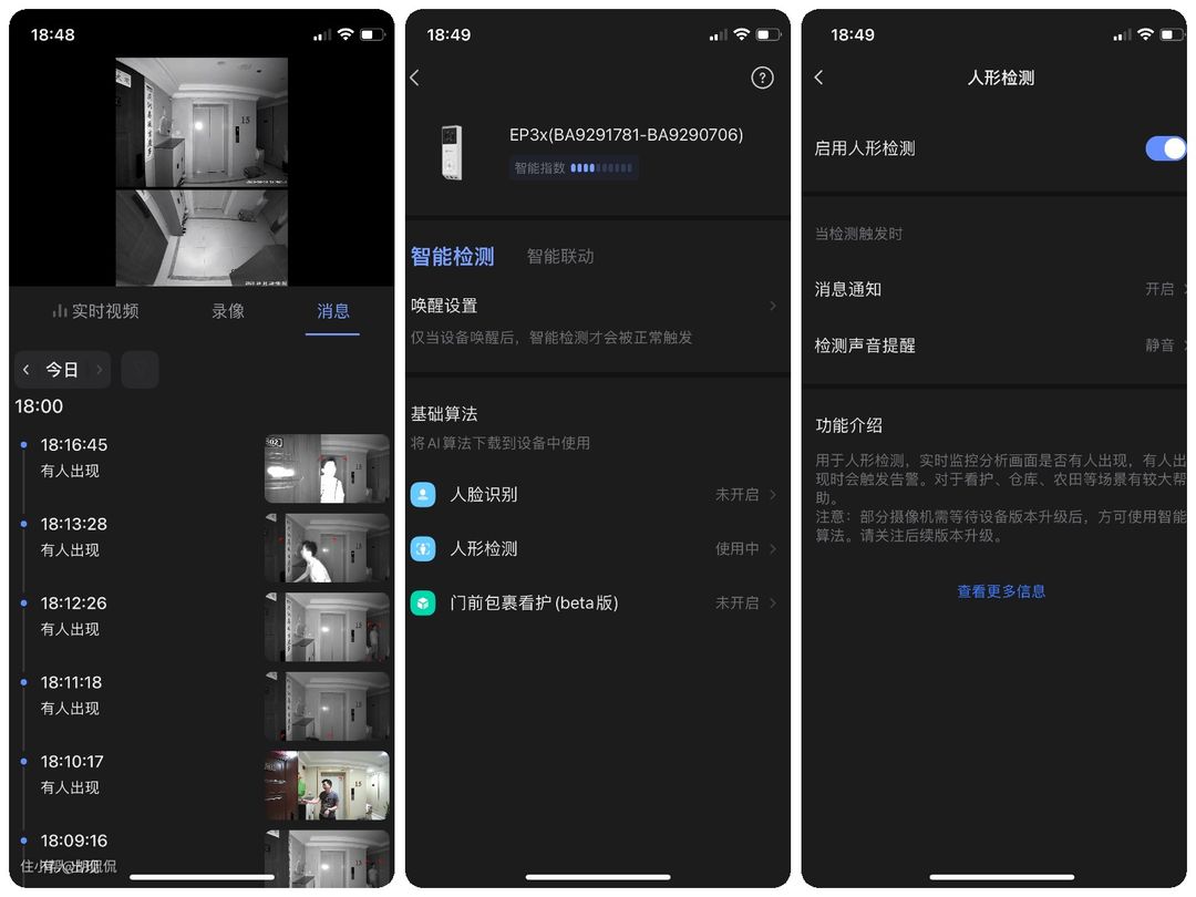 萤石装配了人体感应传感器, 有人迎面走来的时候, 会主动拍摄, 并且将警告推送到手机APP。 AI人形侦测算法,自主设置逗留徘徊时长,当门外的人停留时间超过设定时间时,门铃就会将警报发送到手机app上。 这样也避免了错误判断, 发出过多的错误警报。