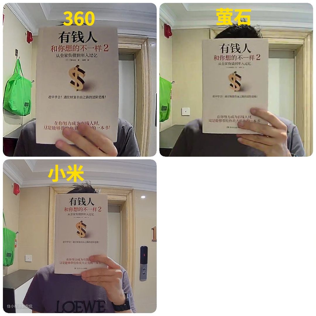 下图是在APP中可视门铃的拍摄画面, 比如可以看到360 6Pro的细节非常多, 整个画面尽收眼底, 小米3在顶上灯光都出现了光晕, 萤石在亮光环境下一片惨白, 没有细节, 这样如果有人从那个地方出现是看不清楚的。