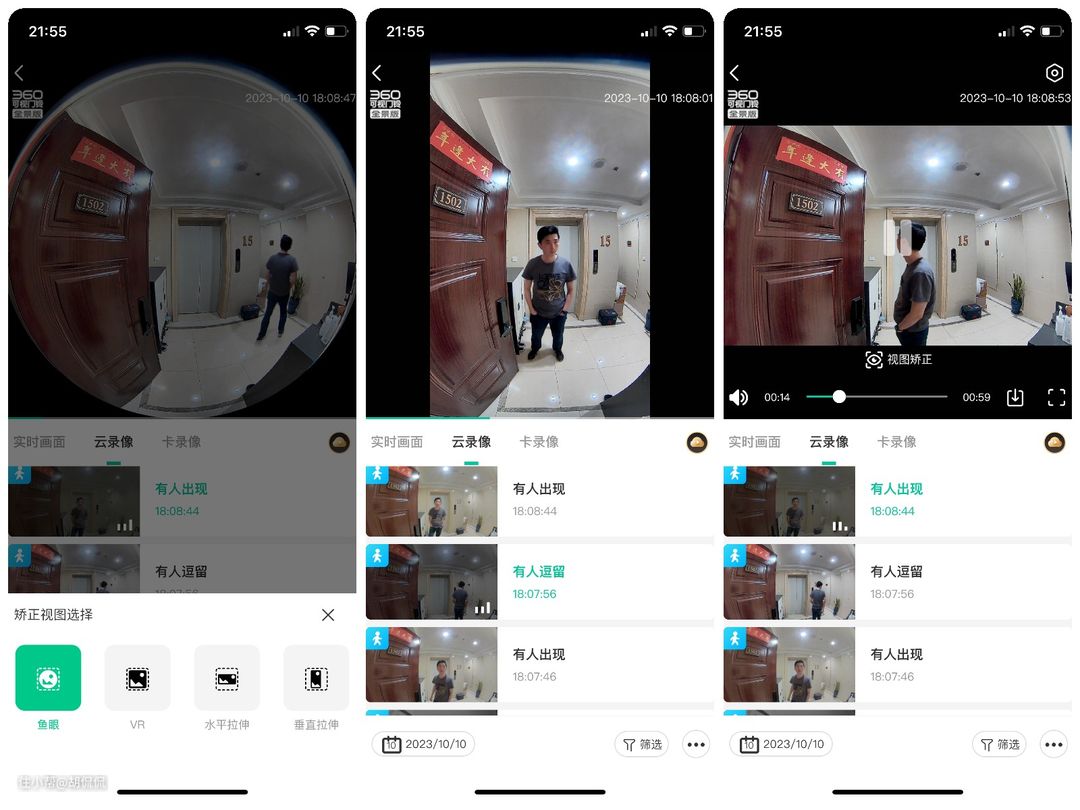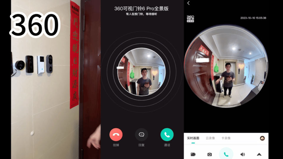 360 6Pro, 在这三款智能门铃中无疑硬件配置是非常突出的, 摄像头分辨率高, 可视角度大, 拍摄清晰,因为360°视角采用了鱼眼镜头,可以实现VR效果, 也可以横评或者竖屏。