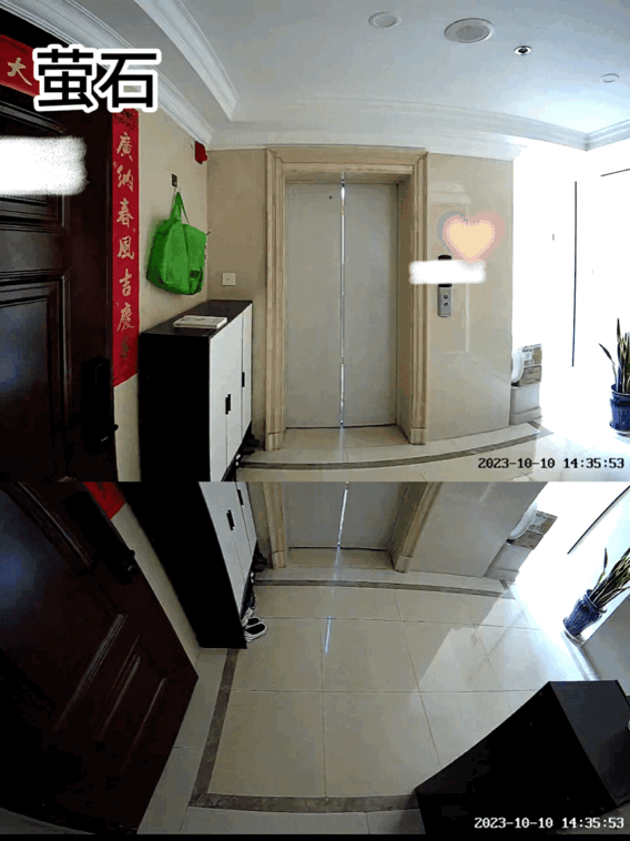 萤石EP3X, 使用了上下两个摄像头, 上摄162° 下摄155°, 组合画面中, 基本视野没有遮挡, 能够接受。