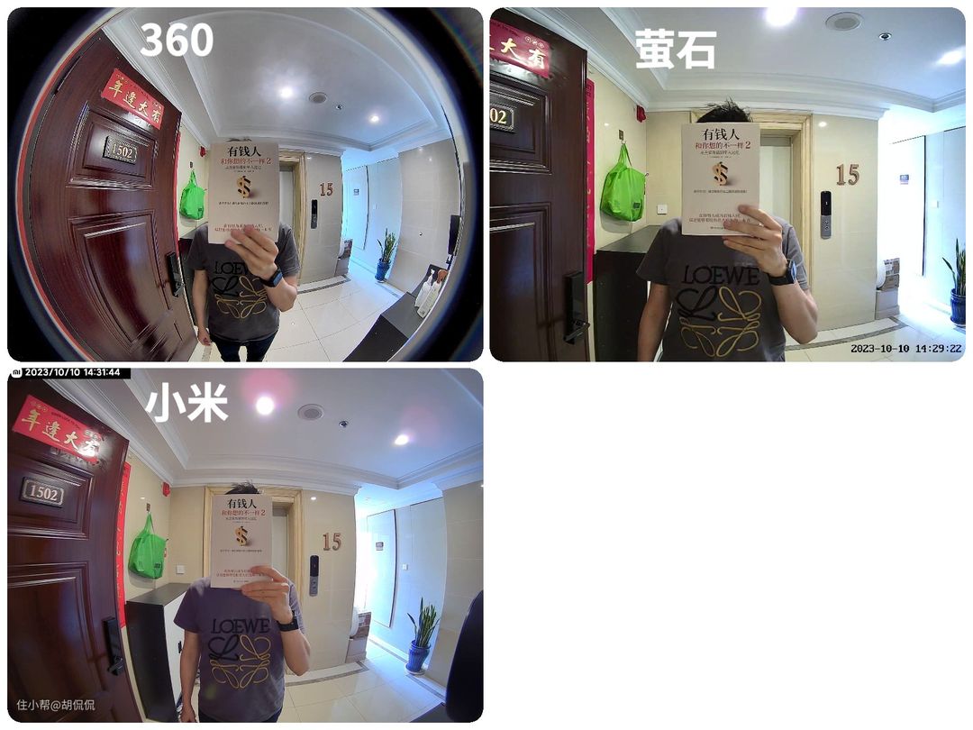 小Tips:大家注意, 三个摄像头我按照的位置基本一致, 相差五厘米左右, 高度基本在一个高度相差五厘米内, 这样方便后续测试有直观感受。 其中360 6Pro智能门铃高度最高, 位置最里面, 这个是一个最吃亏的位置。 我们看后面的测试结果。