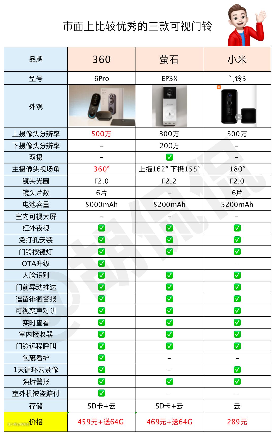 侃侃给大家找来了三个市面上热销的智能可视门铃360 6Pro、萤石EP3X、 小米 门铃3、做了这次对比。