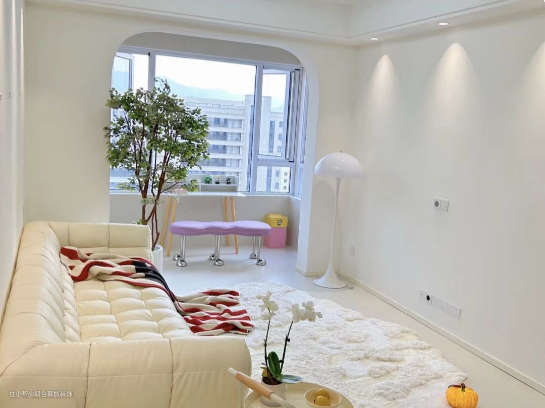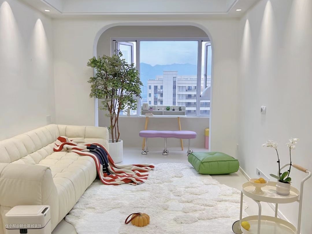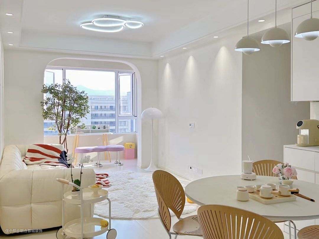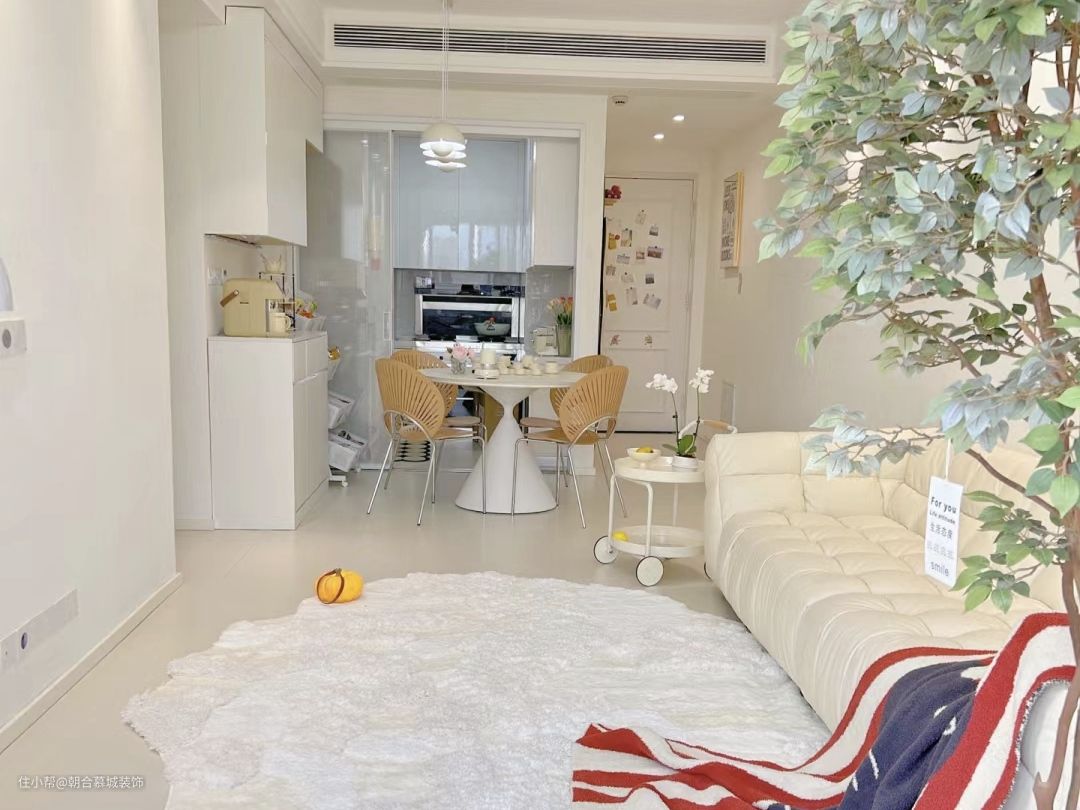 奶油装修风格设计让空间更加柔和舒适,以白色餐桌和奶油色沙发为主,少量绿植点缀空间,让整个房间充满生机。