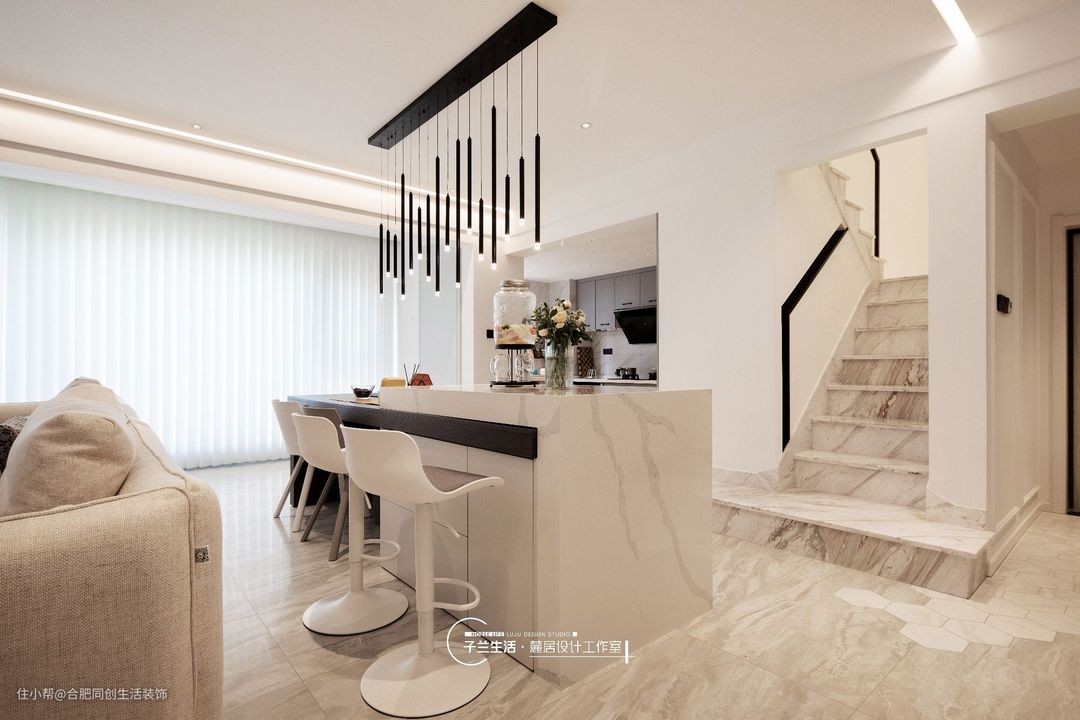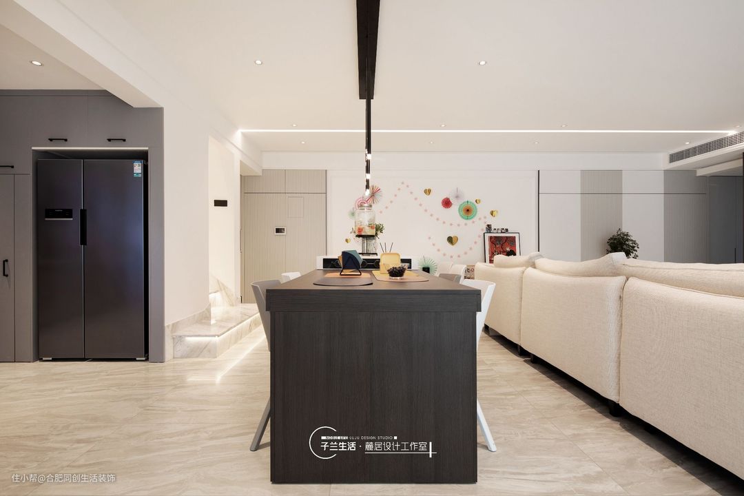 为了与家人之家更好的互动,客厅和餐厅之间没有做任何隔墙、隔断,当在餐厅吧台做一些甜点、饮品的时候,就可以直接看到在客厅玩耍的小朋友。