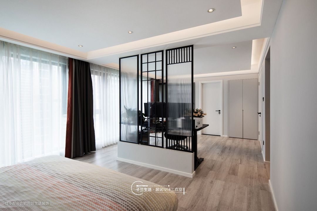 工作区和主卧相连,用屏风做成隔断。晚上加班,也不会影响另一个人休息。
