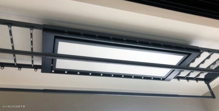 内嵌式适合有吊顶的宝子们,把晾衣架藏在吊顶里,只留下晾衣架部分在外面,感官上存在感更低,只要颜色选对,基本上能和吊顶融为一体,用的时候只需用遥控器把它降下来。