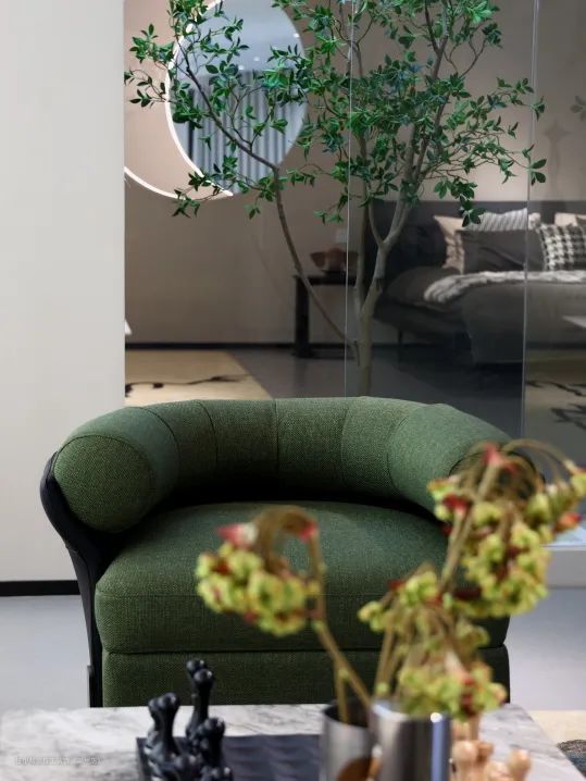这款沙发被摆放在我们全案艺术美学生活馆,以中古风为主题的软装情景区。浓郁的绿色搭配厚重的雪尼尔面料,再次强调了整个空间的复古风情,浪漫又富有情调。