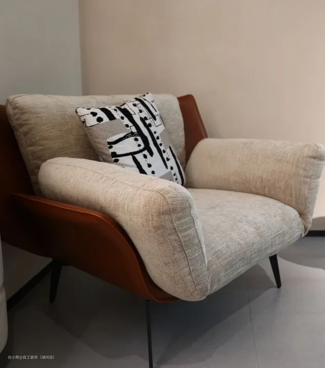 坐垫和靠背厚实饱满,坐感柔软舒适。皮革靠背支撑、布艺面料加上金属椅角,三者达到充分的融合,放在家里每个角落都能展现它的魅力。让人无论是安静的看书,亦或是慵懒的闲坐其中,都可以感到无比的惬意。