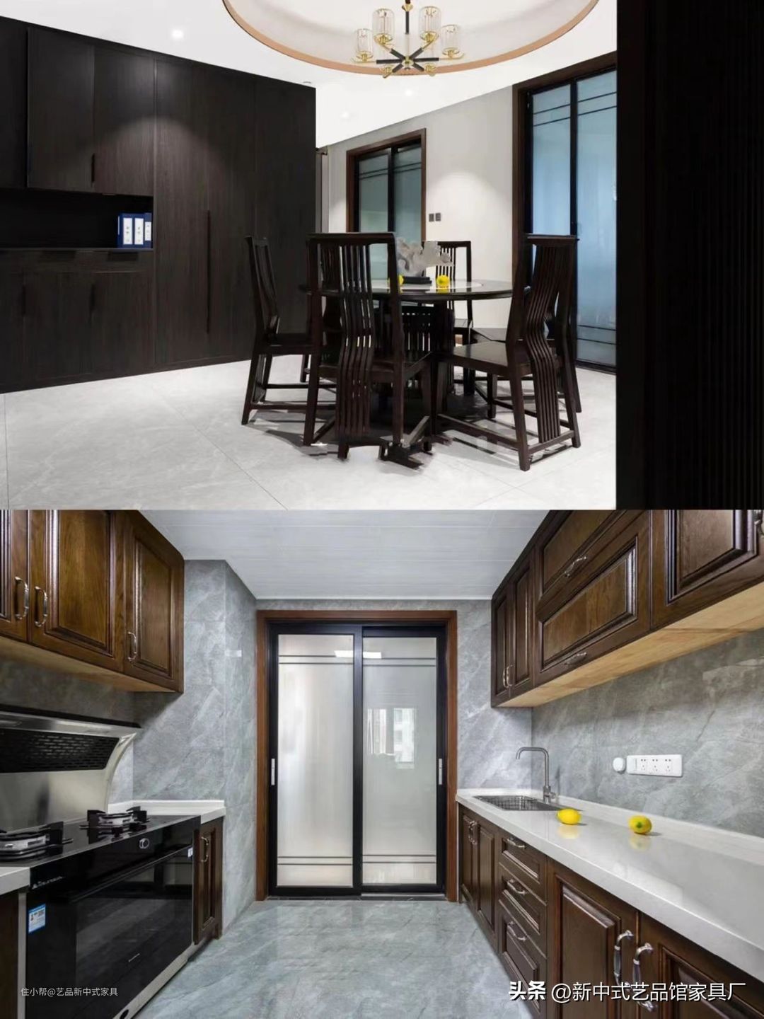新中式餐厅厨房设计,以简约风格展现低调奢华,色彩以灰色与黑色为主,营造出优雅与整洁的氛围;厨房与餐厅各自独立,巧妙布局让烹饪与就餐互不干扰,实木家具精良耐用,餐桌与椅子皆展现出硬木质感,餐桌中央绿色植物增添清新气息,吊灯简约大方,水墨画凸显传统文化内涵,精致屏风分隔餐厅与厨房,层次感十足且雅致非凡。