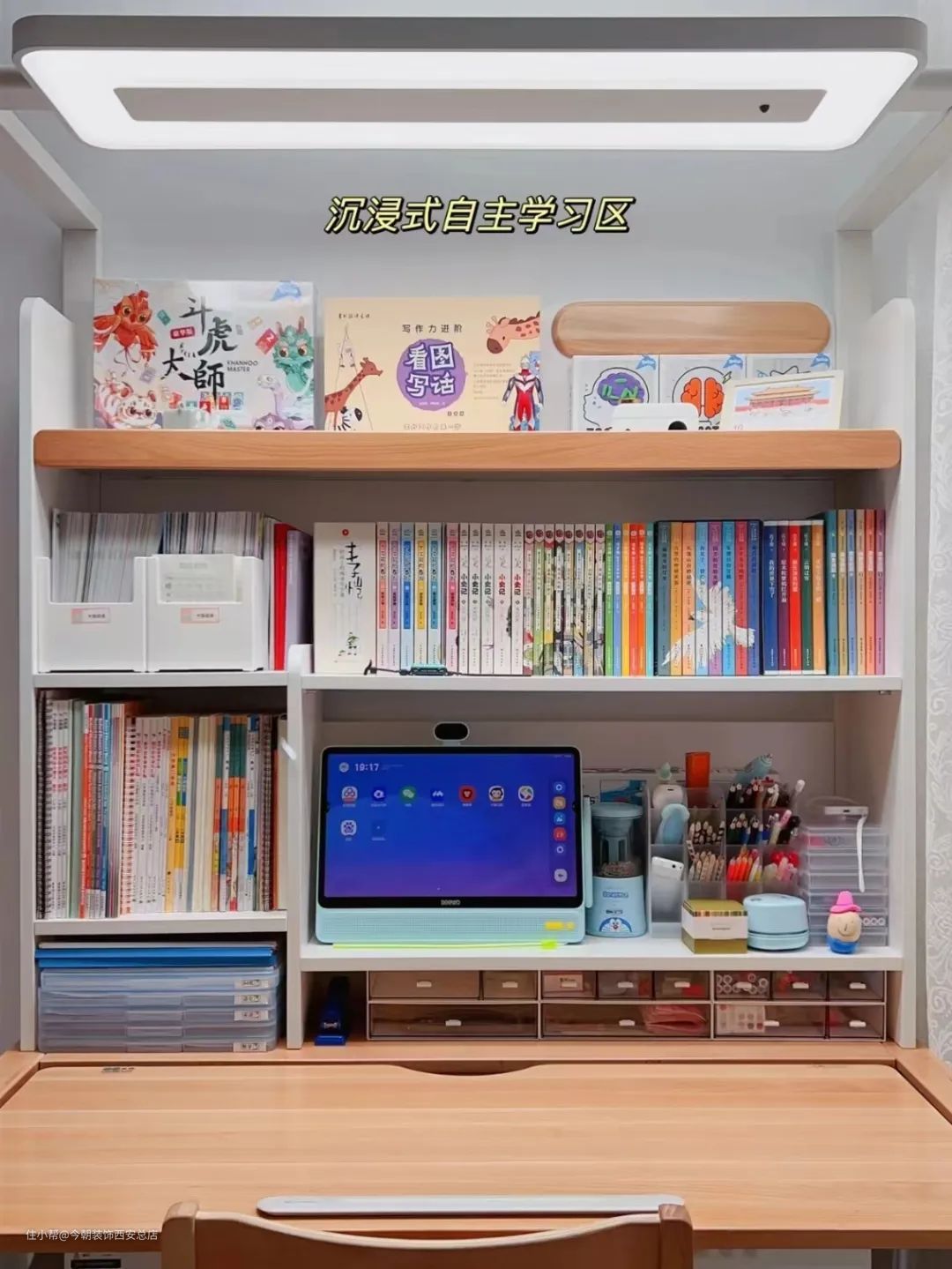 一般儿童学习桌分为4个区域:大绘本区、教科书本区、作业本区、小物件区。