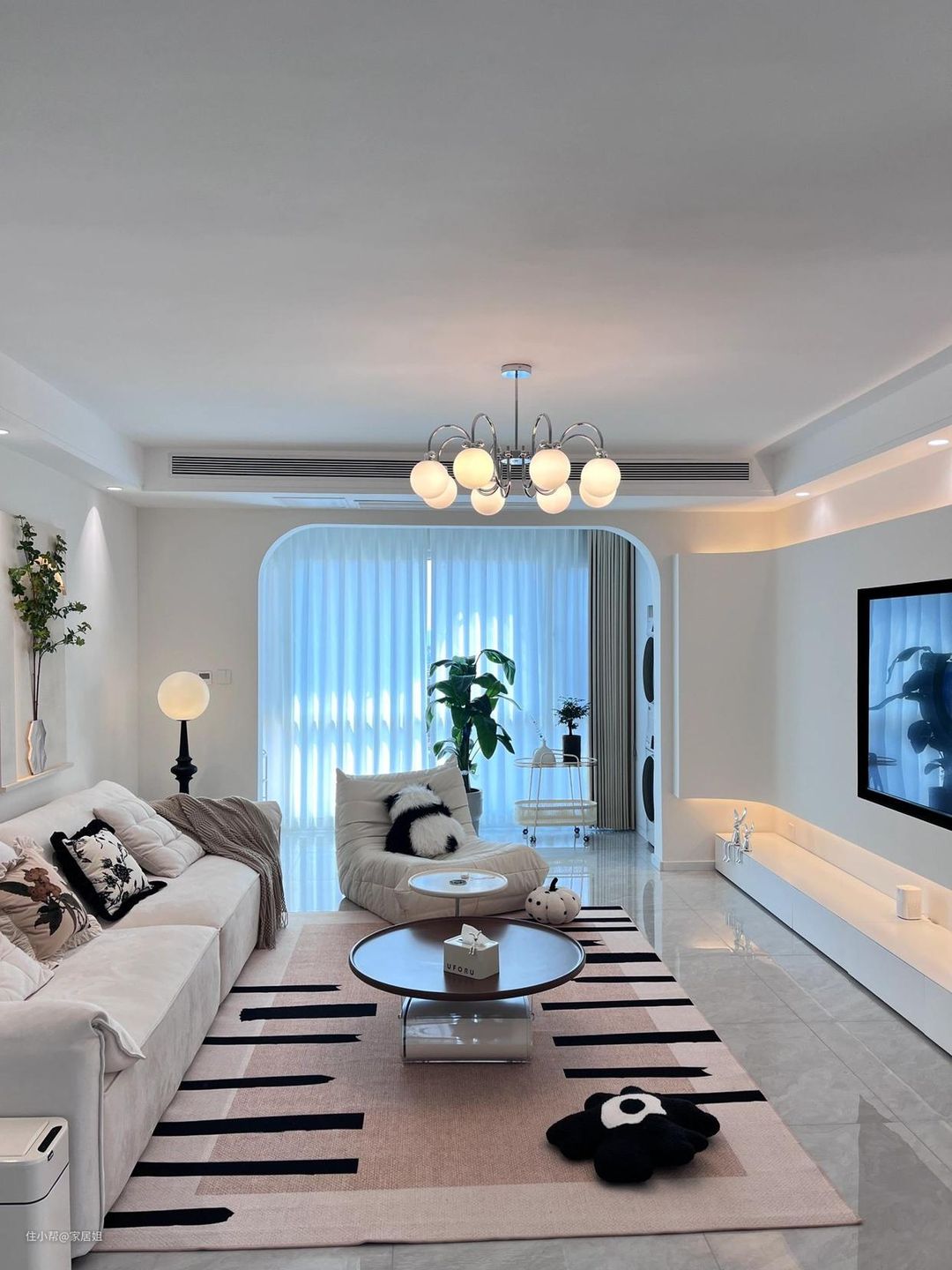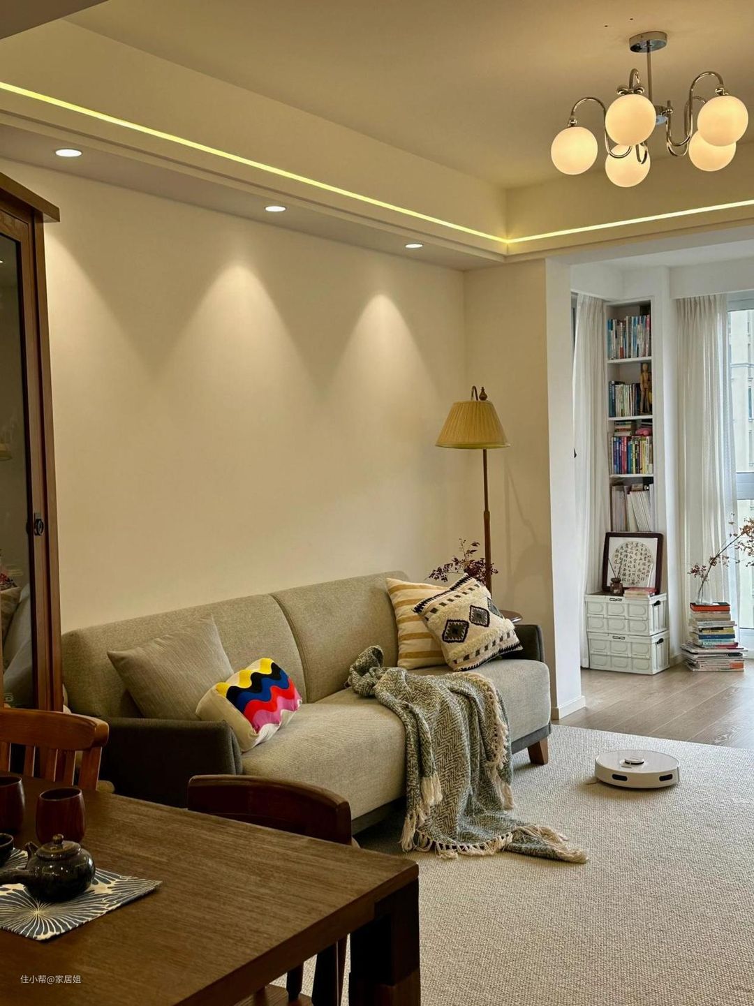 双眼皮造价低,能营造出简约又高级的层次感,还不会过时。双眼皮吊顶结合护眼射灯,小山丘打下来的弧度很有氛围感。