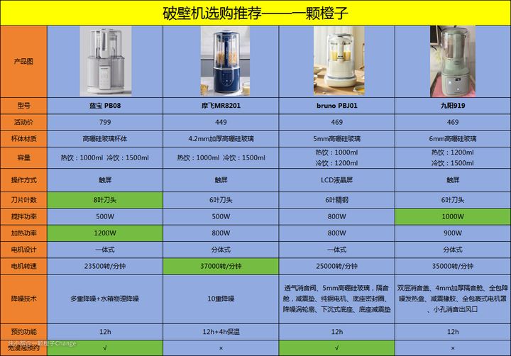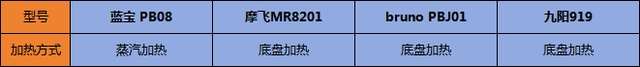 今天给大家展示的几位重量级选手:蓝宝蒸汽破壁机PB08、九阳P919 bruno BZK PBJ01、摩飞MR8210