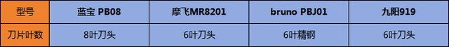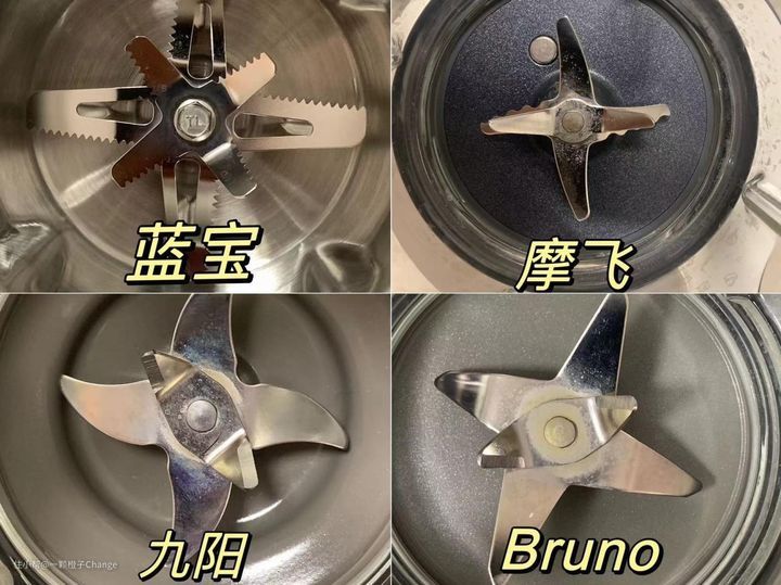 这几款破壁机中,蓝宝的刀头是最多的 总共8叶刀头,其他的均为6叶刀头,其中bruno是精钢刀头,效果也是不错的。