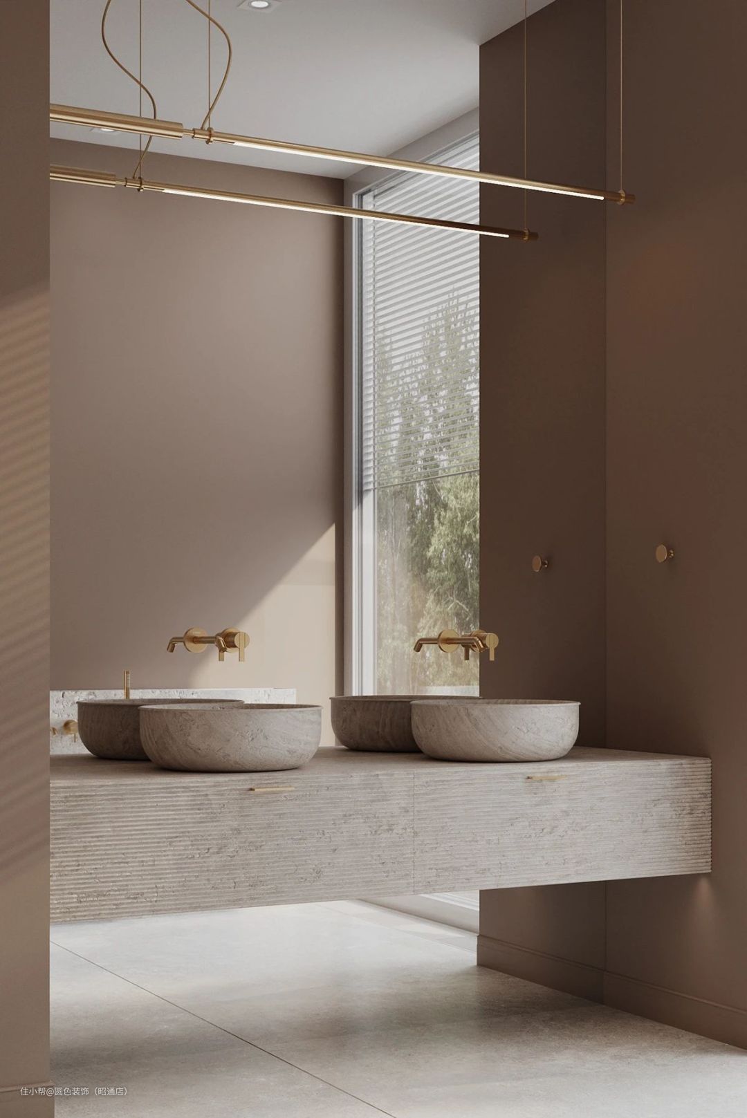 在卫浴用具的选择上,可以选择更圆润的款式,增加柔和感。选择奶油色微水泥或瓷砖通铺卫生间,明亮温暖的颜色,同时弱化轮廓,增加一体感。