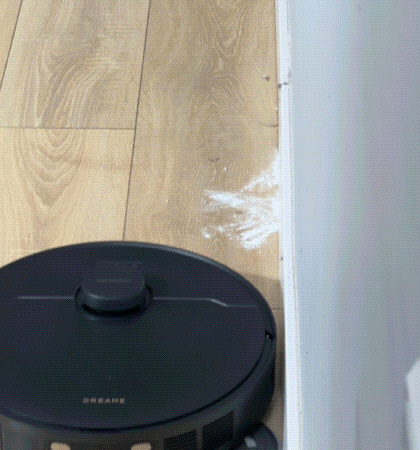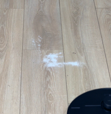 上图就是阳角位置垃圾的清扫,X30灵活的使用机械臂沿着阳角边缘把面粉清扫干净,而且整个过程机身完全没有触碰到桌脚!